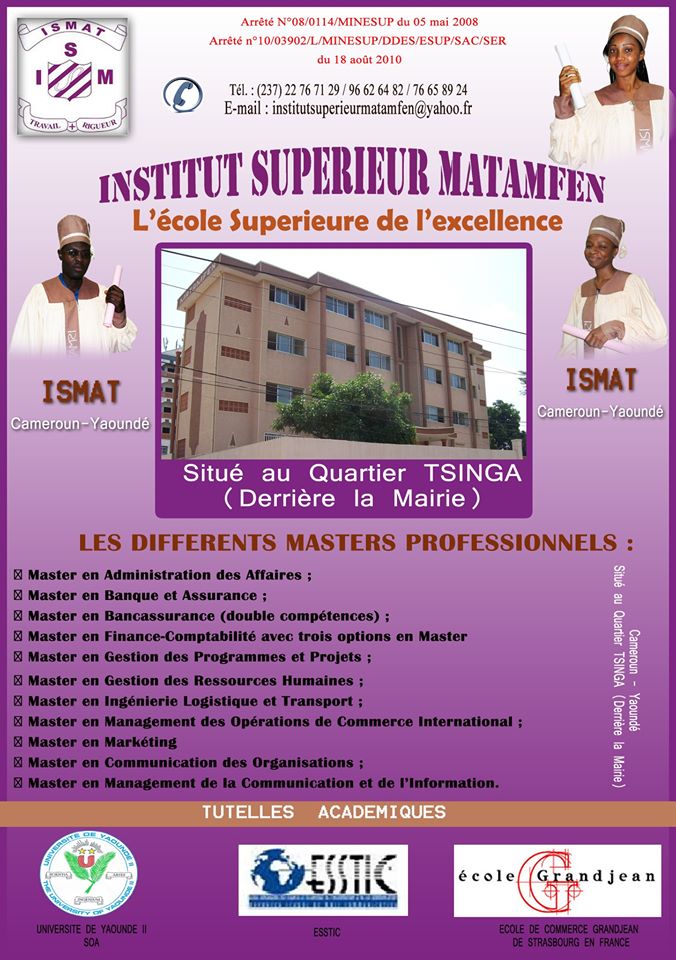 L’Institut Supérieur Matamfen (ISMAT) est un établissement d’enseignement supérieur créé pour permettre aux jeunes camerounais d'acquérir des connaissances à travers le savoir, le savoir-être et le savoir-faire. L’Institut Supérieur Matamfen forme dans plusieurs domaines notamment en : Action Commerciale, banque, communication d’entreprise, comptabilité et gestion des entreprises, commerce international, gestion logistique et transport, secrétariat de direction, informatique de gestion, journalisme, génie civil, assurance, maintenance des systèmes informatiques, photographie – audiovisuel, froid et climatisation, tourisme, maintenance informatique, informatique industrielle, maintenance et après-vente automobile, hôtellerie – restauration, électronique, électrotechnique.