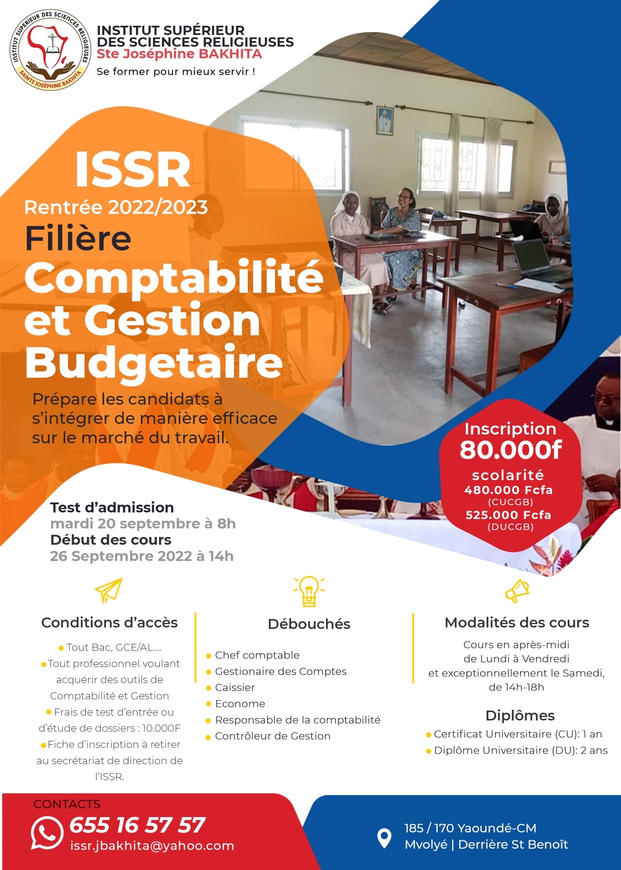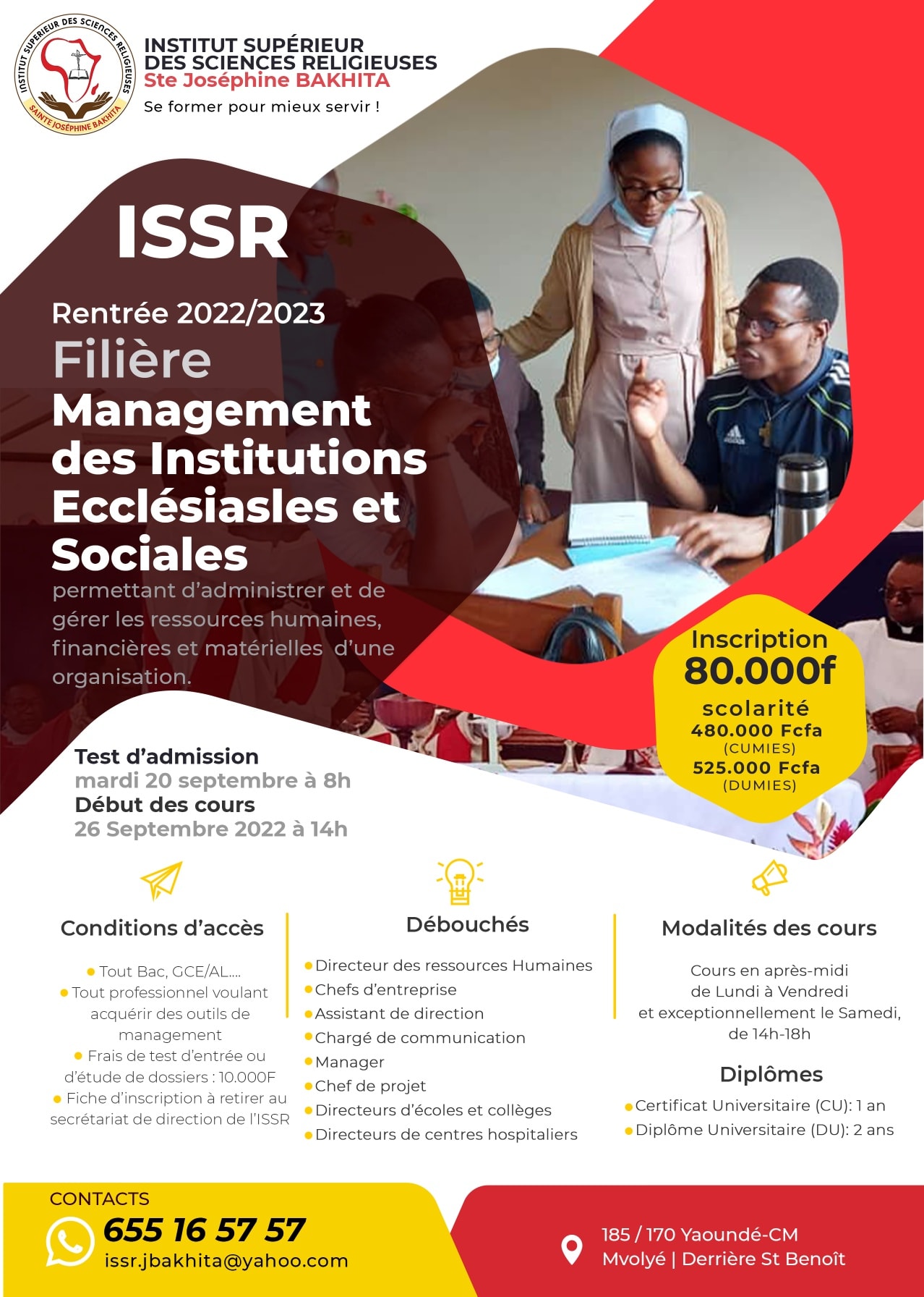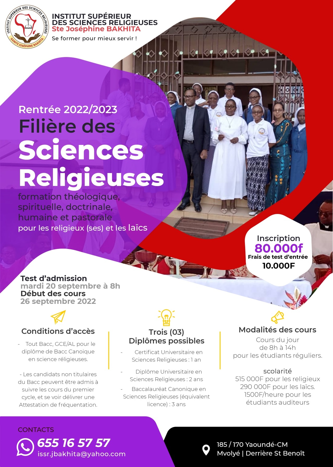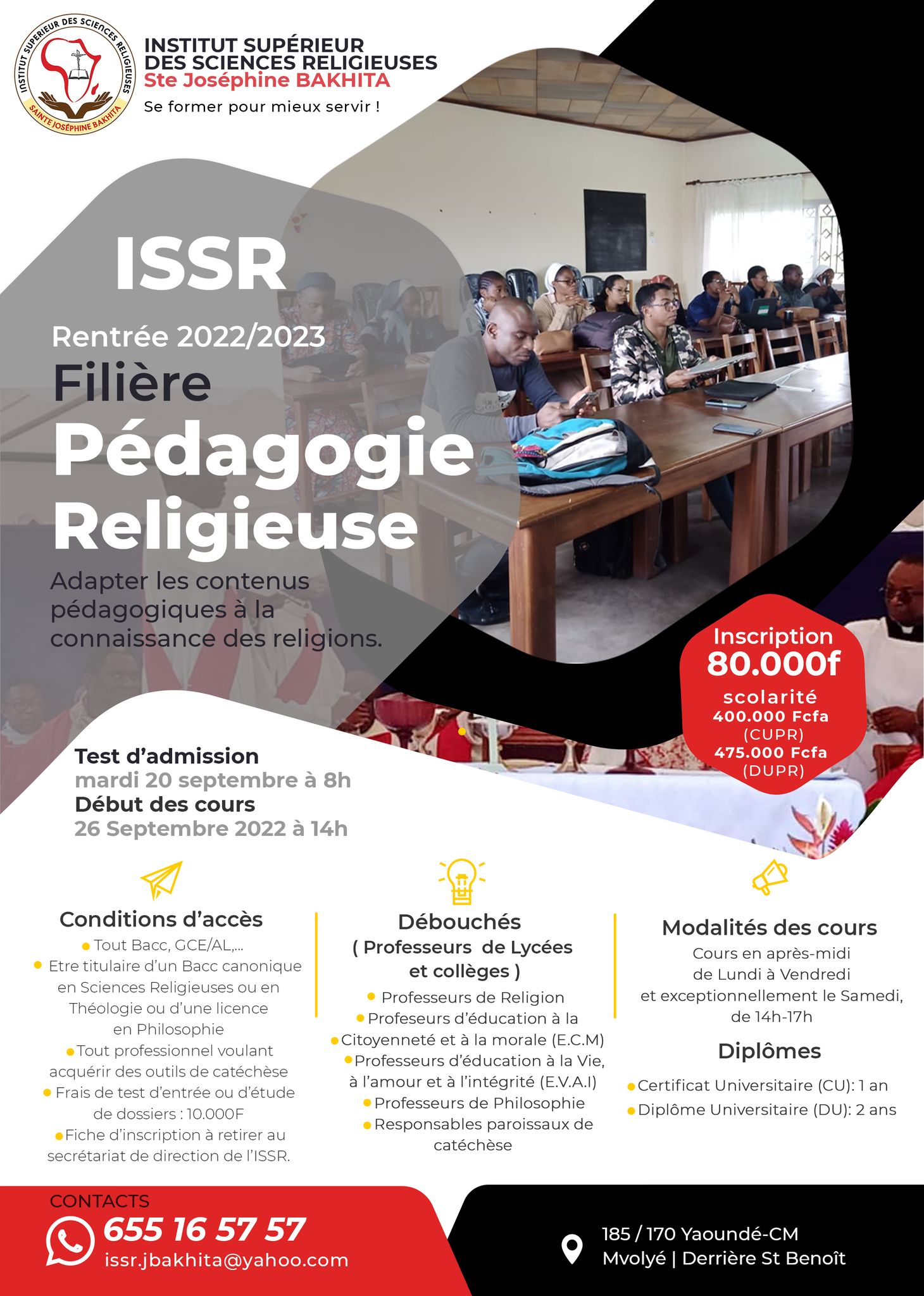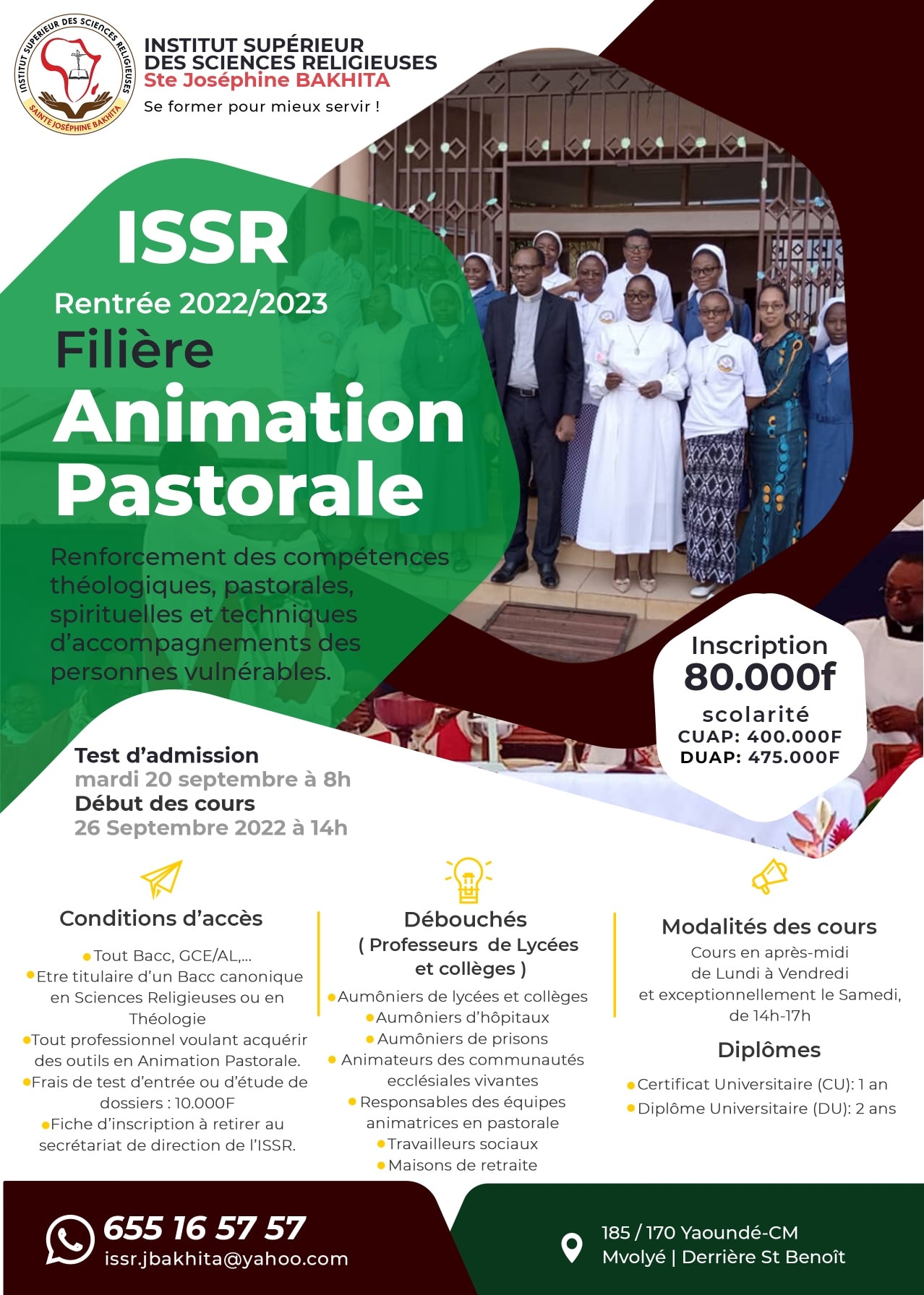 L’Institut Supérieur des Sciences Religieuses Sainte Joséphine Bakhita (ISSR) est destiné aux laïcs, religieux ou religieux qui souhaitent, à l’issue d’un parcours cohérent de trois ou cinq ans, acquérir une licence ou un master en sciences religieuses. Désormais, l’ancien Institut de Théologie Pastorale pour les religieux (ITPR) est canoniquement et officiellement devenu Institut Supérieur des Sciences Religieuses (ISSR). Nous offrons des formations en : sciences religieuses, comptabilité et gestion budgétaire, animation jeunesse, animation pastorale, intervention jeunesse, management des institutions ecclésiales et sociales et en pédagogie religieuse.
