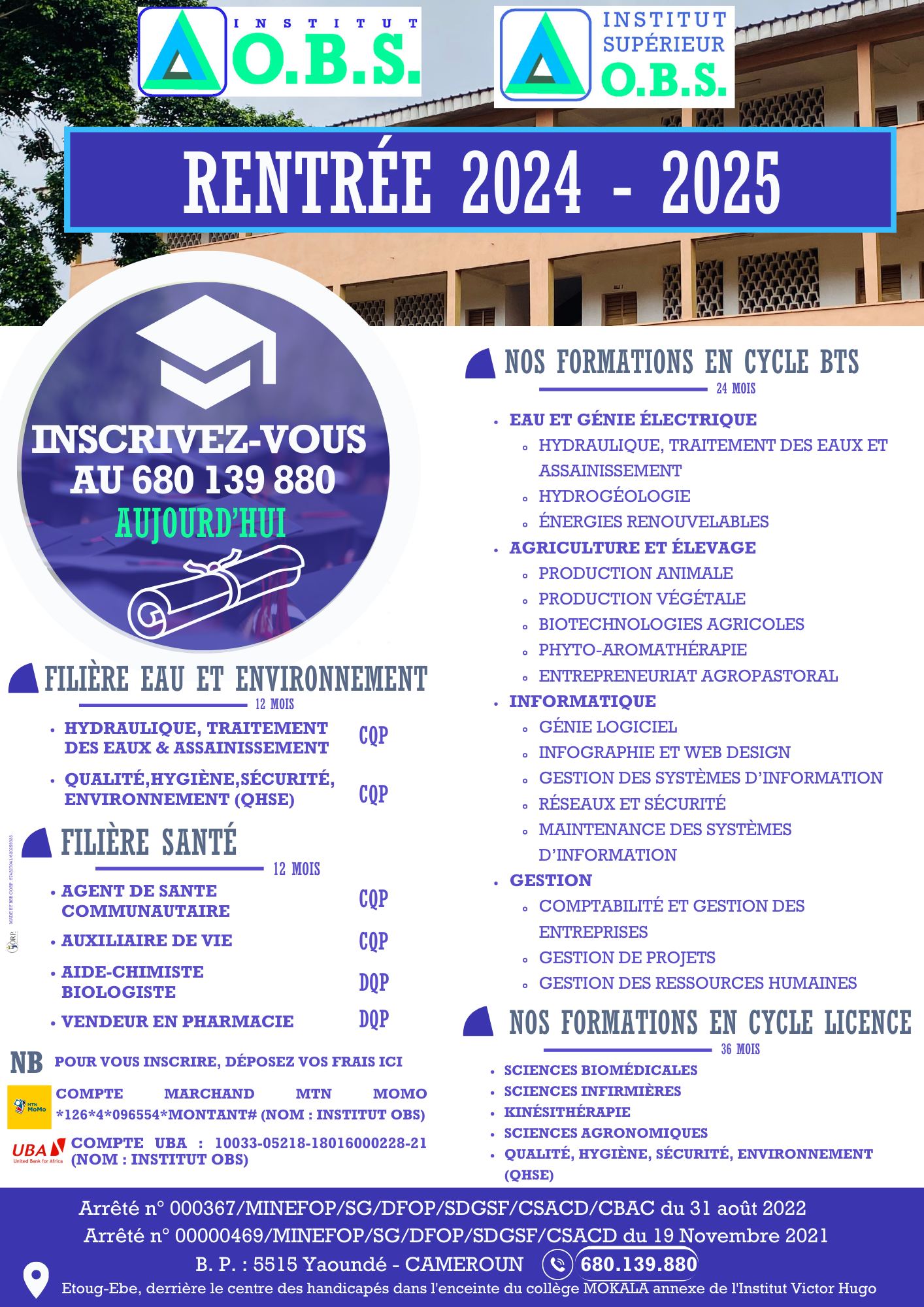 L'Institut de Formation Professionnelle OBS est un centre de Formation professionnelle sur les métiers de Webmaster, eaux et forêts, QHSE, Gestion projets. L'Institut OBS est situé à Yaoundé au quartier Etoug Ebe.