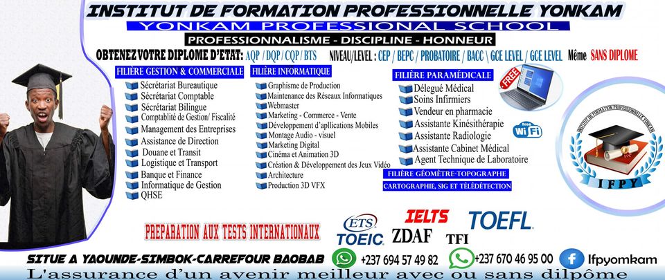 L’Institut de Formation Professionnelle Yonkam (IFPY) est une école de formation professionnelle et langues étrangères accrédité par le MINEFOP. La mission de l’IFPY est d'assurer un enseignement de qualité ainsi que l'insertion socio-professionnelle des jeunes diplômés ou pas dans le marché de l'emploi. IFPY compte plus 30 Filières paramédicales, informatiques, de gestion, géomètre-topographe & cartographie.