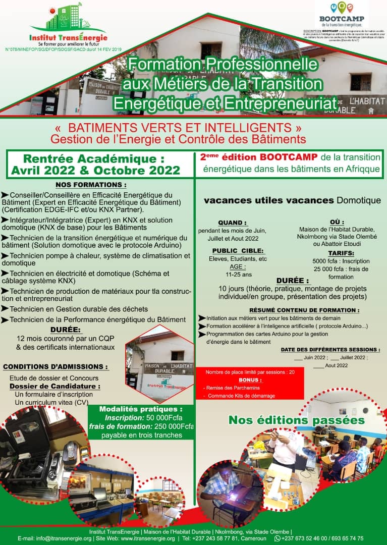 L’Institut de Formation Professionnelle en Transition Énergétique et à l’Entrepreneuriat « Institut TransÉnergie » est un centre de formation professionnelle agréé au Cameroun par l’arrêté N° 078 /MINEFOP/SG/DFOP/SDGSF/SACD du 14 FEV 2019. L’Institut TransEnergie est le premier centre de formation professionnelle agréé par le ministère de l'emploi et de la formation professionnelle pour la formation des acteurs du bâtiment vert et intelligent au Cameroun et en Afrique Centrale. Nos formations sont assurées par des formateurs hautement qualifiés avec de longues années d'expérience.