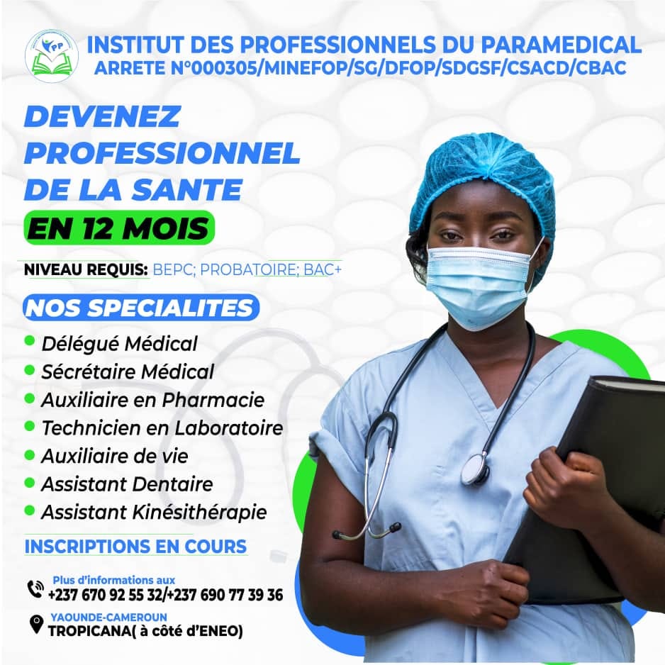 L’Institut des Personnels du Paramédical (IPP) est une école de formation professionnelle qui forme dans les domaines du paramédical : délégué médical, assistant technicien de laboratoire, assistant de vie sociale, secrétaire médical, assistant kinésithérapie, assistant cabinet dentaire. L’Institut des Personnels du Paramédical est situé à Yaoundé Tropicana.