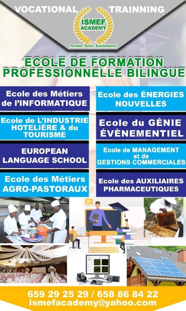 L'Institut des Sciences et Métiers pour l'Emploi (ISMEF Academy) est un centre de formation professionnelle basée à Yaoundé au quartier Biteng. Saviez-vous que malgré le chômage, le marché du travail Camerounais recrute tous les jours ? Ce qu’on ignore souvent c’est que les exigences de ce marché évoluent et changent avec le temps, tout comme la technologie. Et si vous n’êtes pas à jour, vous serez toujours laissé pour compte. C’est pourquoi ISMEF Academy lance en son sein 8 écoles de formation de pointe dans le but de vous rendre irrésistible pour les recruteurs et de répondre aux besoins actuels du marché du travail : Ecole des métiers de l'informatique, Ecole des énergies nouvelles, Ecole de l'industrie hôtelière et tourisme, Ecole du génie événementiel, European language school, Ecole de management et de commerce, Ecole des métiers agro-pastoraux, Ecole des auxiliaires medio-pharmaceutiques. Nous vous rendons irrésistible sur le marché de l'emploi en orientant et en développant votre potentiel par de courtes formations plus un accompagnement.