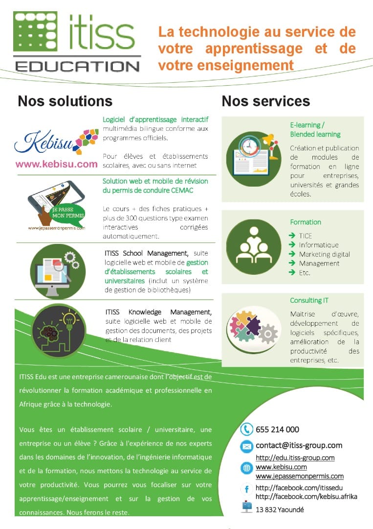 Itiss Edu est une entreprise fondée en 2016 dans le but d'améliorer la qualité de l'éducation et de la formation professionnelle en Afrique grâce à la technologie, via la fourniture de solutions et services informatiques personnalisés aux écoles, aux entreprises et aux individus. En effet, nous croyons fermement qu'une éducation de qualité est indispensable au développement durable de l'Afrique et que la construction d'une culture de formation efficace et rentable dans nos entreprises est une nécessité aujourd'hui. Grâce à l'expérience de nos experts dans les domaines informatique et de la formation, nous sommes qualifiés pour améliorer la productivité et la réussite de nos clients en leur permettant grâce à la technologie de se concentrer sur leur enseignement ou leur apprentissage de manière plus efficace et plus rentable. Itiss Edu vous propose une gamme de produits dont la Suite Itiss School Management, la Suite Itiss Knowledge Management et Kebisu.