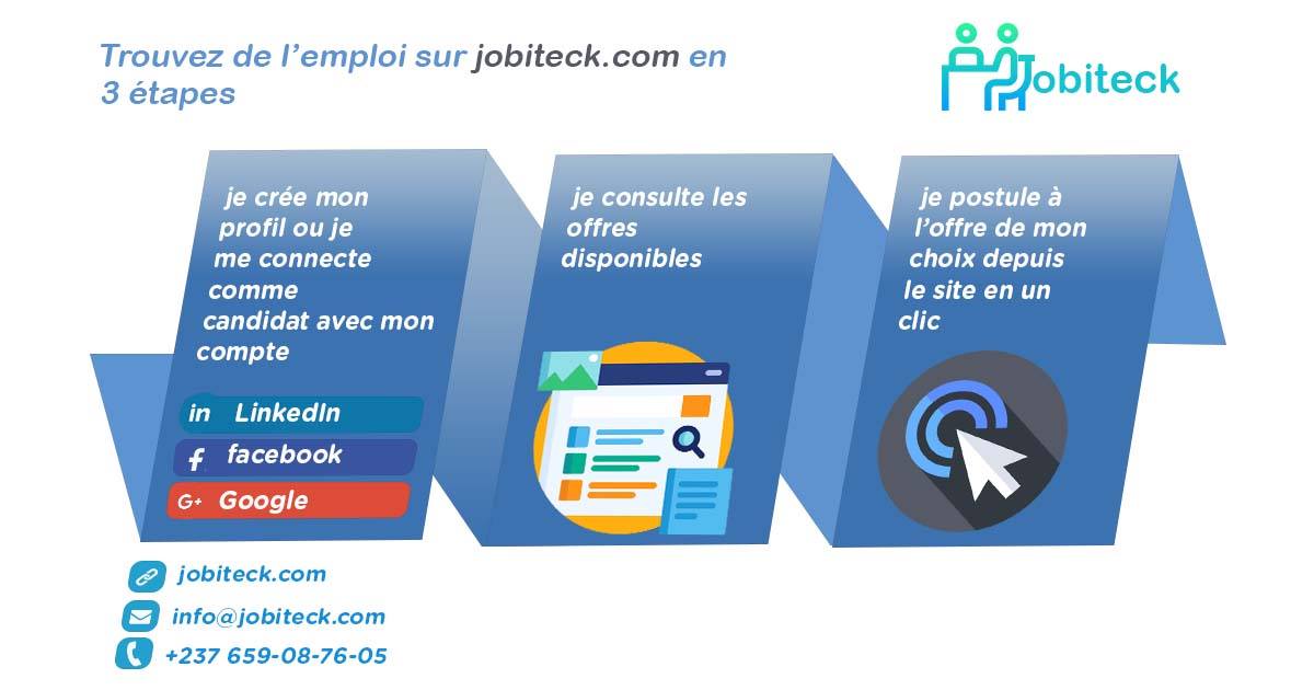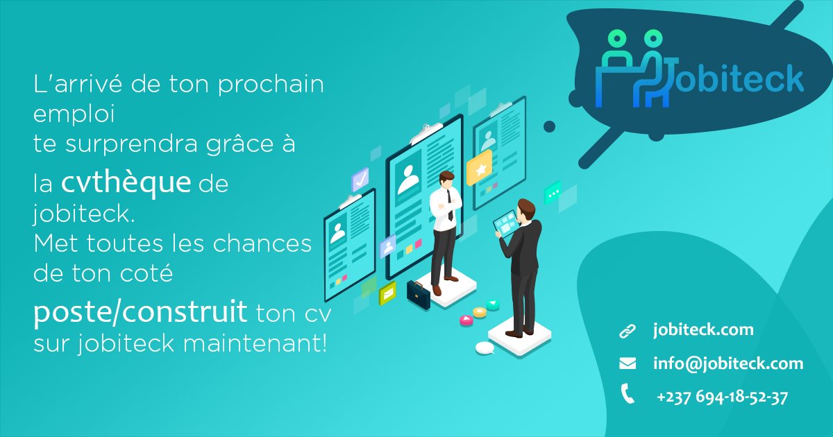 Jobiteck est une plateforme web Camerounaise d'annonces des offres de stage, d'emplois et de bourses d'études. Cest un espace qui propose des offres et dispose une Cvthèque où sont rangés de multiples CV de differents candidats enrégistrés sur la plateforme.