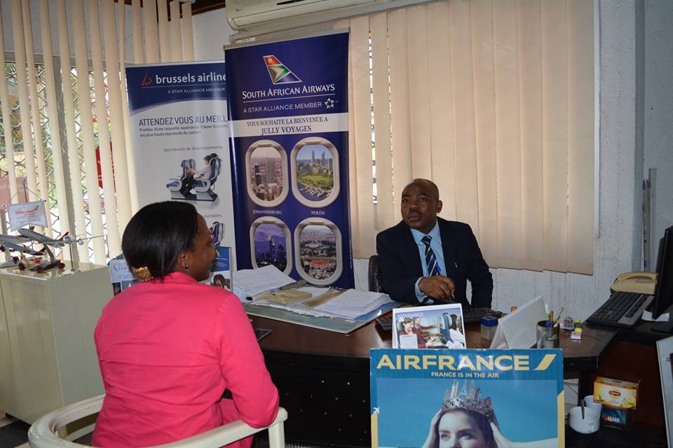 Créée depuis 1977, Jully voyages est une agence de voyage et de tourisme. Doté d’un personnel qualifié, dynamique, responsable et disponible, elle est spécialisée dans : la vente des billets d’avion, la location de voitures, la conception et la promotion des produits touristiques, l’organisation des rencontres nationales et internationales, la vente des chambres d’hôtels, l’assistance des clients aux formalités d’arrivée et de départ, la vente d’assurance voyage, la conception et la réalisation des évènements ainsi que, l’envoi et la réception des fonds money gram et flash transfert. Nos agences de Douala et Yaoundé, notre hôtel Résidence jully à Kribi, notre hôtel jully guest à Yaoundé hippodrome nous permettent de répondre au mieux à vos exigences.