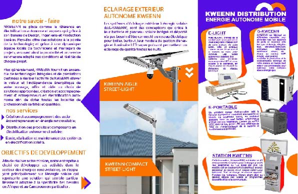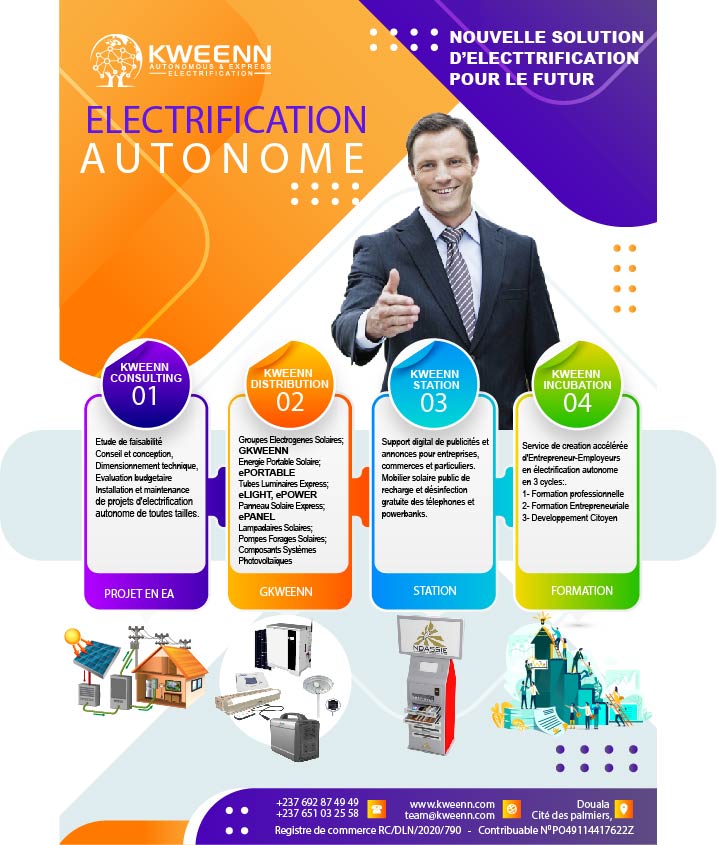 KWEENN est le portail sous régional d'électrification autonome qui accompagne constructeurs, distributeurs, commerces, municipalités, familles et autres dans l'étude, la réalisation, le contrôle et la maintenance des projets d'électrification autonome et d’ économie d’ énergie de toutes puissances; suivant les normes technologiques internationales, les réalités locales et budget disponible. KWEENN se place comme la référence en électrification autonome et express qui grâce à son bureau de Design, Ingénierie et Production basé au Pays-Bas offre des solutions à la pointe de la technologie; et grâce à une dynamique équipe locale de techniciens et managers de projets, assurant ainsi la proximité et un service sur-mesure adapté aux conditions et réalités de chaque projet. Plus généralement, KWEENN fournit un ensemble de technologies intégrées et de prestations destinées à réaliser l'activité de KWEENN (élever la valeur et l'indépendance énergétique de votre ouvrage, offre et aide au choix de solutions appropriées, création et accompagnement d'entrepreneurs en électrification autonome afin de doter toutes les localités de professionnels certifiés et qualifiés).