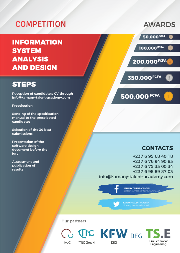 La Kamany Talent Academy (KTA) est une initiative Allemande au service du talent Camerounais. Elle permet de mettre en avant le savoir-faire Camerounais dans un environnement professionnel convivial. Pour ce faire elle possède en son sein: – une cellule qui permet de jauger les compétences techniques, sociales et entrepreneuriales; – une cellule de suivi pour stage, emploi, projet de fin d’étude; – une cellule pour développement et conception des projets Allemands et locaux du domaine des TIC. Toutes ces cellules permettent à la KTA d’avoir des sujets compétents et mieux outillés pour être placés aux services des entreprises. Chez KTA nous croyons que la valorisation du talent est la clé de l’émergence. Le meilleur commence ICI !