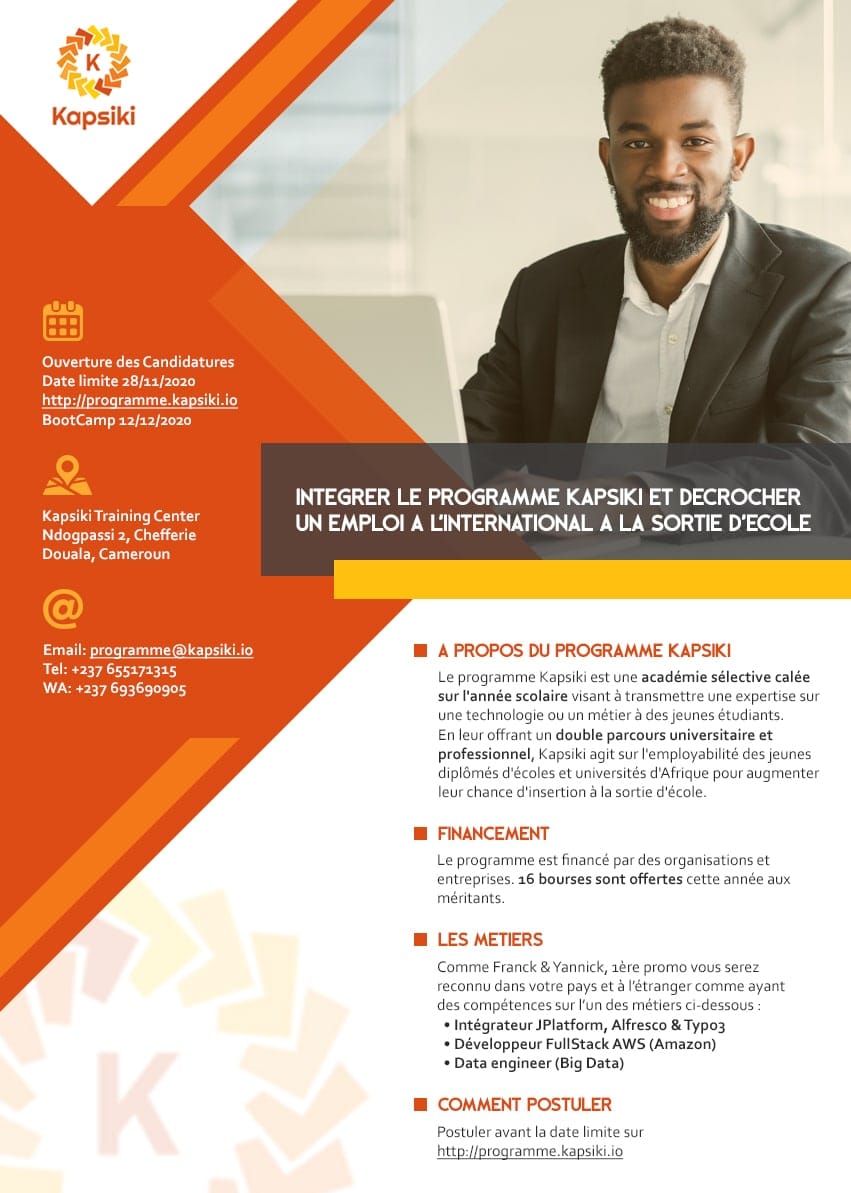 Le Kapsiki Training Center est une académie sélective calée sur l'année scolaire visant à transférer une expertise sur une technologie ou un métier à des jeunes étudiants en fin d'études. En leur offrant un double parcours universitaire et professionnel, Kapsiki agit sur l'employabilité des jeunes diplômés d'écoles et universités d'Afrique en d'augmentant leur chance d'insertion à la sortie d'école. Grâce à notre méthode pédagogique innovante basée sur l'e-formation, les apprenants alternent entre enseignement à l'université et tutorat en ligne dans des classes virtuelles et interactives animées par des formateurs bénévoles. Les formateurs sont pour la plupart à distance, basés n'importe où dans le monde. La rigueur, la bienveillance, le haut niveau d'expertise transmis par nos experts dans leur domaine à ces jeunes leur permet d'intégrer physiquement ou à distance pendant et /ou dès leur sortie d'école des équipes projets dans des entreprises internationales exigeants de très haut niveau de compétences.
