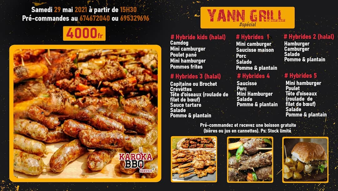 Karoka BBQ Service c’est d’abord un service traiteur qui vous accompagne pour tous vos événements privés et publics. Qu’il s’agisse de réunion d’affaire, mariage, Baptême ou anniversaire, Karoka BBQ Service vous assure un service haut de gamme principalement constitué de Grillades. Ils vous fournissent ce dont vous avez besoin pour un Barbecue réussi. Karoka BBQ Service vous propose également dans son restaurant situé à l’Avenue Germaine, Yaoundé de somptueuses grillades, des plats internationaux revisités, à l’instar du Camburger, et du Maxi Karoka Burger, des cocktails et boissons froides et chaudes, qui sauront vous satisfaire. Le tout dans un environnement chaleureux, une ambiance conviviale et cosy.