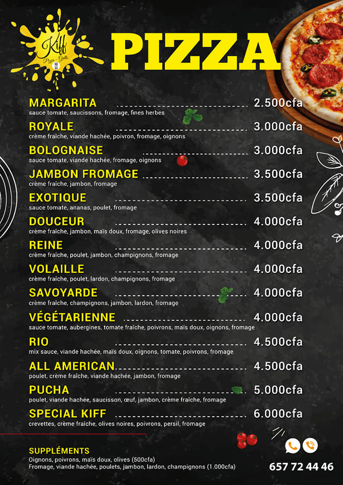 Le Kiff est un fast food pizzaria situé à Yaoundé au quartier Biyem – Assi. Rendez-vous au Kiff pour passer un instant privilégié en compagnie de votre chéri(e), en famille ou entre amis.