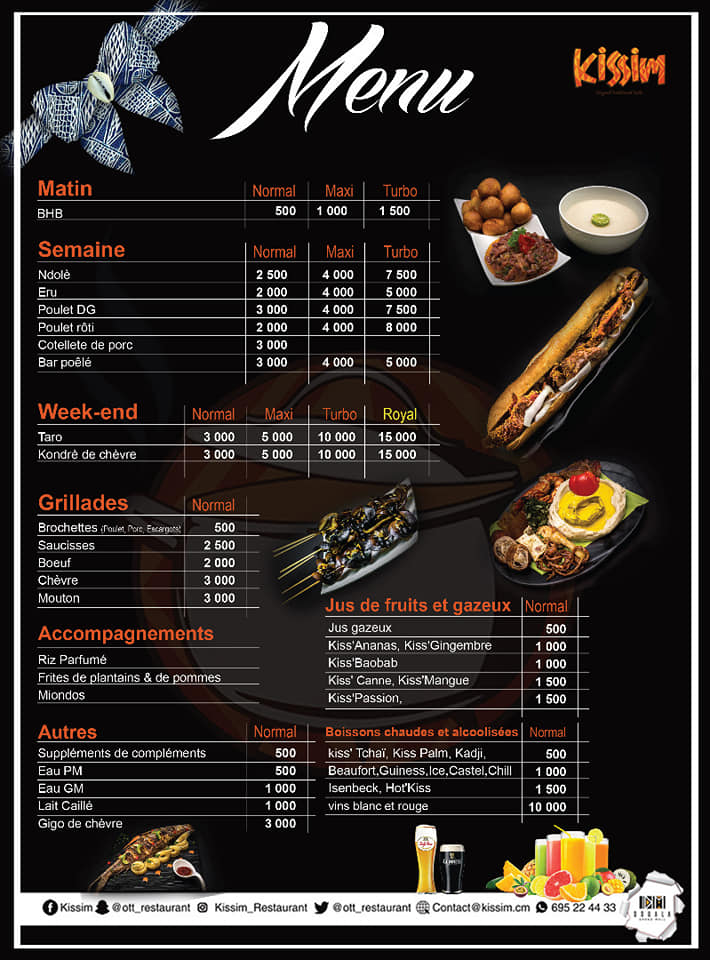 Adresse incontournable du Douala Grand Mall, Kissim restaurant est un véritable carrefour de saveurs culinaires, chaleureux et vivant. Animé tout au long de la journée, on s’y retrouve pour déjeuner, dîner ou pour siroter un cocktail avec des proches. Au balcon du foodcourt, on profite de la vue pour un repas nordique à l’abri de l’agitation des vas et viens des clients et autres usagers. La carte de menu est signée de Mahove, notre jeune chef. Côté service, on retrouve l’élégance et le naturel de Josslyne et Eric sans oublier le sourire et le dynamisme de notre caissière Linda. Kissim propose un large choix de spécialités du terroir à emporter aussi bien au petit déjeuner, au déjeuner qu’au dîner avec à la clé des boissons naturelles et rafraîchissantes. Par ailleurs, le restaurant Kissim s’adapte à toutes vos envies pour des repas en groupe sur le site où l’organisation de vos divers événements.