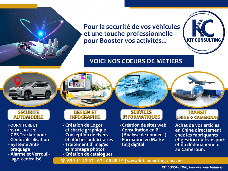 Kit Consulting est une entreprise de prestation de service de géolocalisation. Vous êtes propriétaire d'une voiture, d'un bus, d'un camion, d'une moto, d'un taxi ou de toute une flotte de véhicules, vous souhaitez garder un visuel permanent sur vos véhicules à travers votre téléphone ou votre ordinateur afin de les sécuriser et d'anticiper sur les cas de vol, Kit Consulting met à votre disposition un kit GPS Tracker pour vous faciliter la vie et sécuriser vos engins roulants sur tout l'étendue du territoire camerounais. Vous pourrez localiser en temps réel votre voiture, couper le moteur à distance, recevoir des notifications en cas de soucis sur votre téléphone et bien d'autres fonctionnalités encore à découvrir.