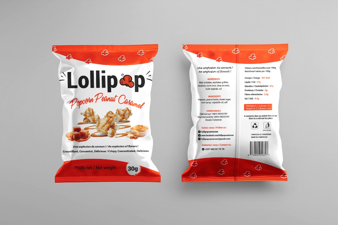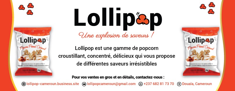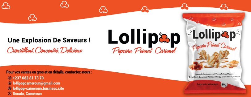 Lollipop Cameroun est une entreprise de popcorn au Cameroun. Lollipop Cameroun produit et commercialise du popcorn croustillant, concentré, et délicieux. Nous sommes situés à Douala, la magnifique capitale économique du Cameroun. Lollipop Cameroun est une marque de produits fabriqués par TAM’S INDUSTRY depuis 2022. Le popcorn faisant partie des friandises au Cameroun, la marque Lollipop Cameroun est née après une longue analyse : • Manque de proximité : Le popcorn au Cameroun n’est pas accessible dans tous les points de vente tels que : les supermarchés, boutiques, vente à la sauvette • Gamme limitée : la saveur actuellement présente sur le marché est le popcorn sucré ; certains vendeurs ambulants proposent du popcorn au lait. • Manque de qualité : le popcorn disponible sur le marché est ensaché dans des plastiques transparents. Ce popcorn est produit dans une machine à popcorn et vendu en bordure de route. TAM’S INDUSTRY veut assurer la proximité de cette friandise sur l’étendue du territoire du Cameroun ; une gamme variée en saveurs, ceci dans le respect des exigences sanitaires et les normes de qualité. C’est pourquoi nous proposons comme première saveur le popcorn peanut caramel. Les autres saveurs seront mises sur le marché au fur et à mesure de l'évolution de la demande. Nos produits sont également disponibles en Afrique Centrale notamment au Gabon. Notre mission est de promouvoir le secteur agroalimentaire au Cameroun et de valoriser les produits made in Cameroon.