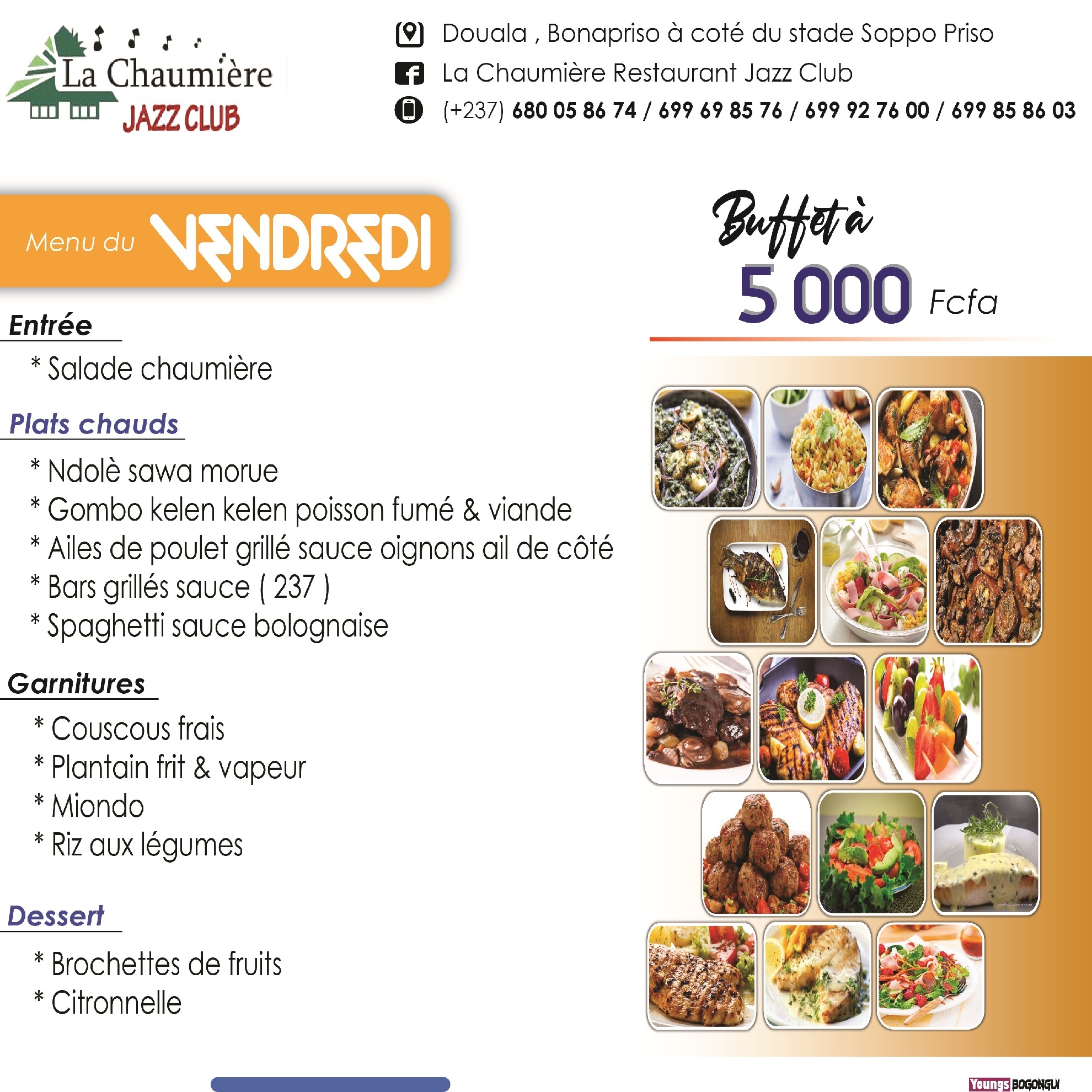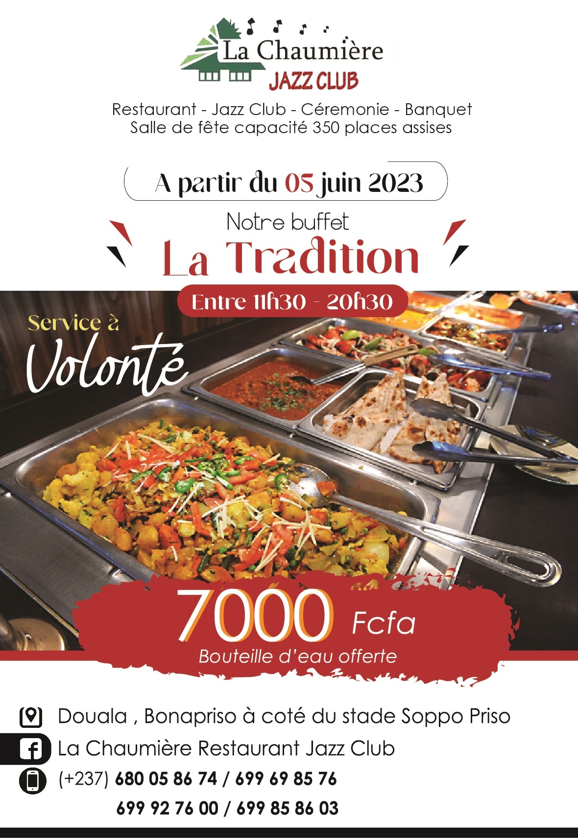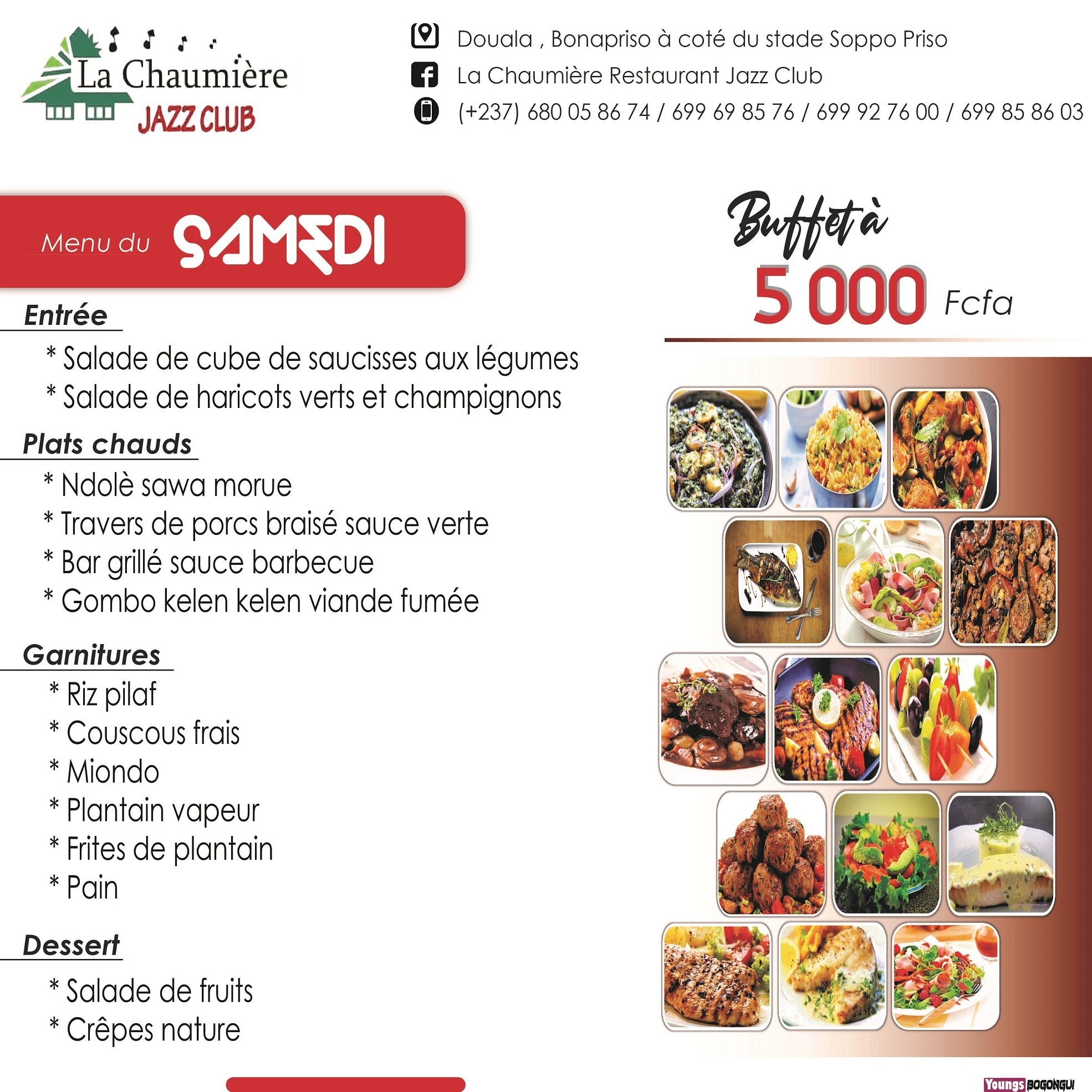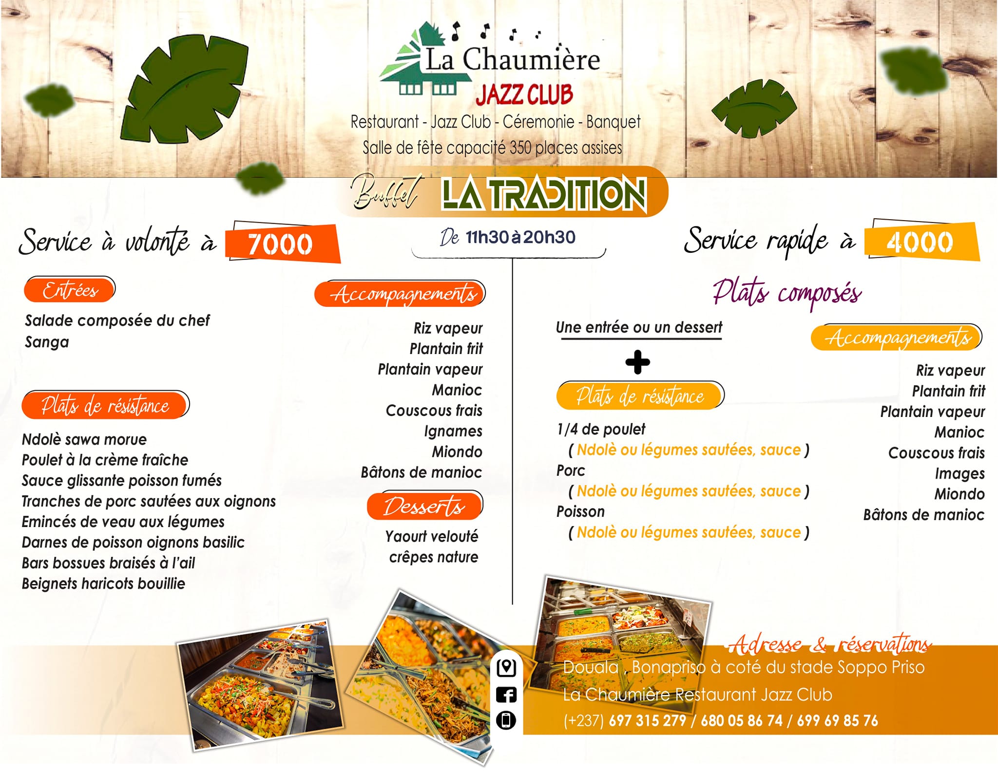 La Chaumière Restaurant Jazz Club est un établissement de restauration dotée de plus de 14 ans d’expérience dans la restauration. Il fait partie du Complexe récréatif La Chaumière (COFOSA). Réputée pour la qualité et la diversité de sa cuisine, le Restaurant la Chaumière est situé au quartier Bonapriso, à l’Avenue Paul Soppo Priso, en face de l’ex Polyclinique Soppo. Nous disposons d’une salle des banquets et de conférences, d’un espace pour séminaires avec vidéo projecteur, d’un carré VIP , un bar VIP avec whiskies d’Age, vins haut de gamme et cigares, d’un orchestre musical pour vos soirées de détentes après le travail (Afterwork), d’un personnel qualifié et expérimenté pour vos buffets, cocktails et autres réceptions.