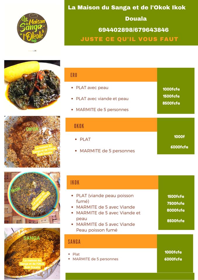 Vous êtes Marmite ou plat de Sanga ou d'Okok/Ikok ? Dans la ville de Douala, La maison du sanga et de l'Okok/Ikok livre les plats et marmites de sanga/okok/ikok selon vos goûts.