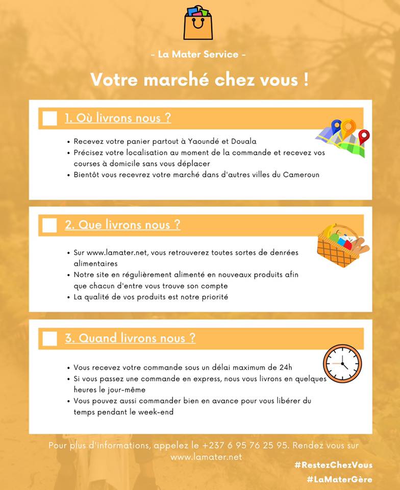 La Mater Service est un site pour les courses en ligne. La Mater ne vend pas de produits et ne dispose pas de stock. Elle fait uniquement de la livraison en faisant vos courses dans les marchés et supermarchés de la place. Parmi les produits livrés, on retrouve viandes, poissons, fruits, légumes, épices, boissons, huiles, produits de boulangerie. Avec La Mater service, vos courses sont livrés en 24h.