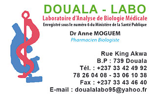 Créé en 1978 et repris en 1995 par Dr Anne MOGUEM, Pharmacienne Biologiste, entourée d'une forte équipe de personnel qualifié. Le Laboratoire Douala Labo, est un laboratoire d’examens médicaux pluridisciplinaire, constitué d’un plateau technique automatisé. Il est basé au quartier AKWA, dans la métropole de Douala. Le Laboratoire Douala Labo accueille les patients dans un cadre convivial, de confiance et d'écoute où le maître mot est « disponibilité, écoute et service de qualité ». Animé par un désir et une volonté d'offrir les prestations de qualité par un diagnostic rapide et précis qui contribuera efficacement a un bon choix thérapeutique. Le matériel automatisé à 80% assure une qualité avec des références internationales.