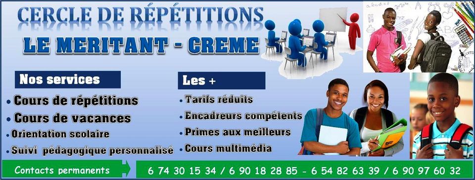 Recherchez-vous un groupe de soutien scolaire expérimenté ? Vous êtes à la bonne adresse. Le Méritant, depuis 2003, est un groupe spécialisé dans le soutien scolaire et la préparation aux concours d'entrée dans les grandes écoles camerounaises. Depuis notre création, nous ne ménageons aucun effort pour rester au sommet de notre art, l’art du soutien scolaire, l’art de transmettre les connaissances et avec succès aux élèves. Nos résultats le prouvent à suffisance.