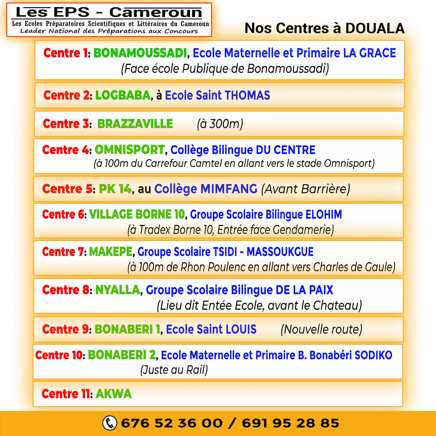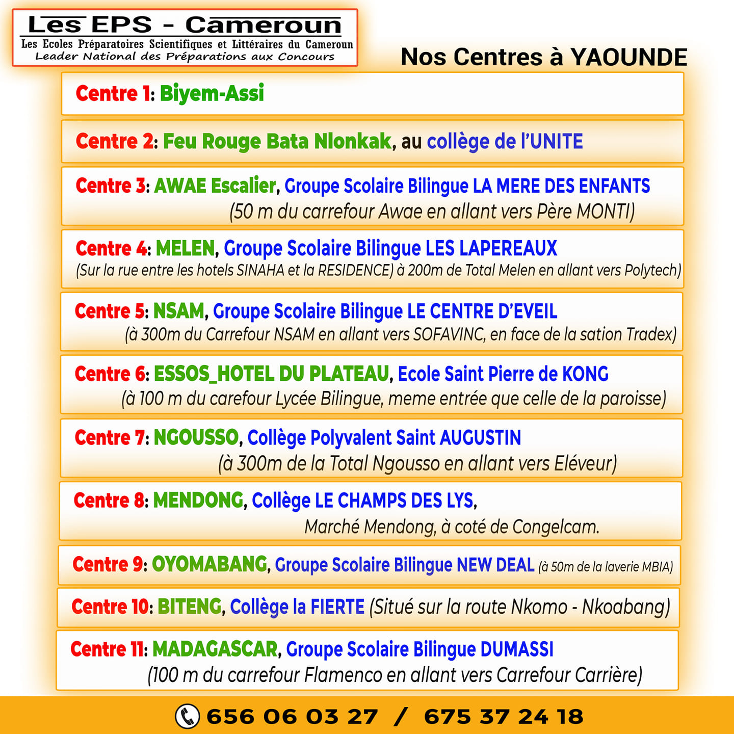 Les Écoles Préparatoires Scientifiques du Cameroun (Les EPS CAMEROUN) sont des écoles de préparation aux concours dirigées par des élèves ingénieurs de Polytechnique, de l’ISSEA, des étudiants de l’IFORD, des élèves médecins, des professeurs des lycées et collèges, des élèves professeurs, etc. Les EPS CAMEROUN tracent depuis 19 ans une voie originale fondée sur la fiabilité d’un savoir scientifique et pédagogique et dont les objectifs sont de préparer efficacement les candidats aux concours nationaux et internationaux.