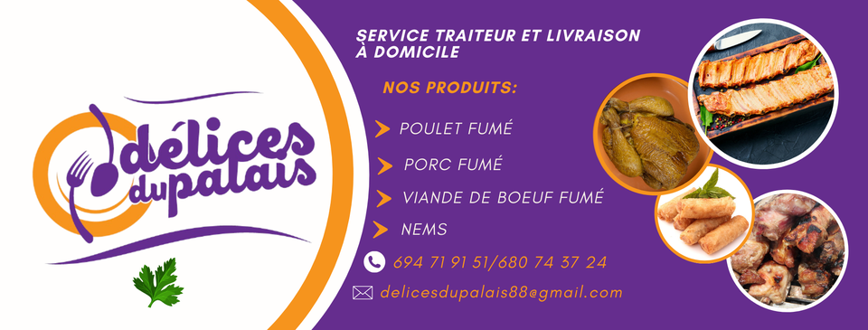 Les Délices du Palais est un service de livraison de repas et service traiteur basé à Douala. Nous sommes spécialisées dans la viande fumée notamment le poulet, le porc et le bœuf, et également les nems.