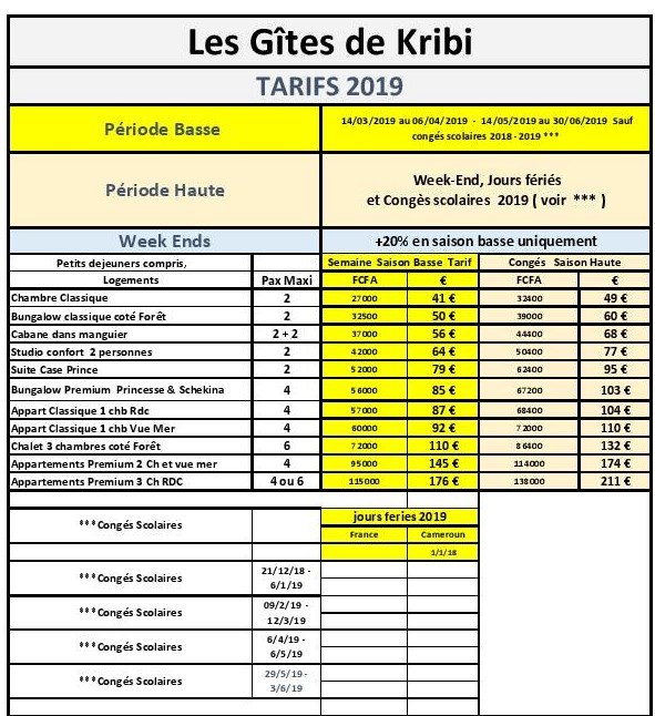 Kribi est la première cité balnéaire du Cameroun et la destination privilégiée des Camerounais mais aussi des touristes du monde entier. L'Hôtel-Restaurant Les Gites de Kribi, ouvert en 2007 a acquis sa réputation grâce a une exigence de qualité, choix d'hébergements, sécurité. Une de nos priorités est la formation se son personnel au contact de clients exigeants sur la propreté, le confort, l'écoute. Un restaurant réputé, Au Plaisir du Goût, a été ajouté il y a 4 ans, pieds dans l'eau avec une cuisine raffinée dans un cadre paradisiaque. Les Gites de Kribi sont prêts à vos accueillir et à vous faire découvrir les richesses des côtes camerounaises.