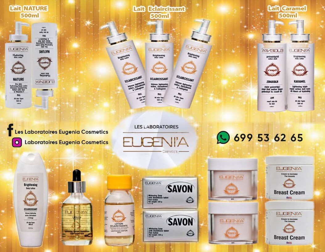 Le Laboratoire Eugenia Cosmetics est un laboratoire cosmétique spécialisé dans la fabrication des produits cosmétiques et les consultations dermatologiques sur la base desquelles sont prescrit des produits adaptés aux cas par cas. Eugenia Cosmetics vous propose toute une gamme de lotions, sérums, crèmes et savons notamment Eugenia éclaircissant, Eugenia karamel, Eugenia nature, Eugenia vitamine e, crème Eugenia, sérum Eugenia, lotion éclaircissante Eugenia.