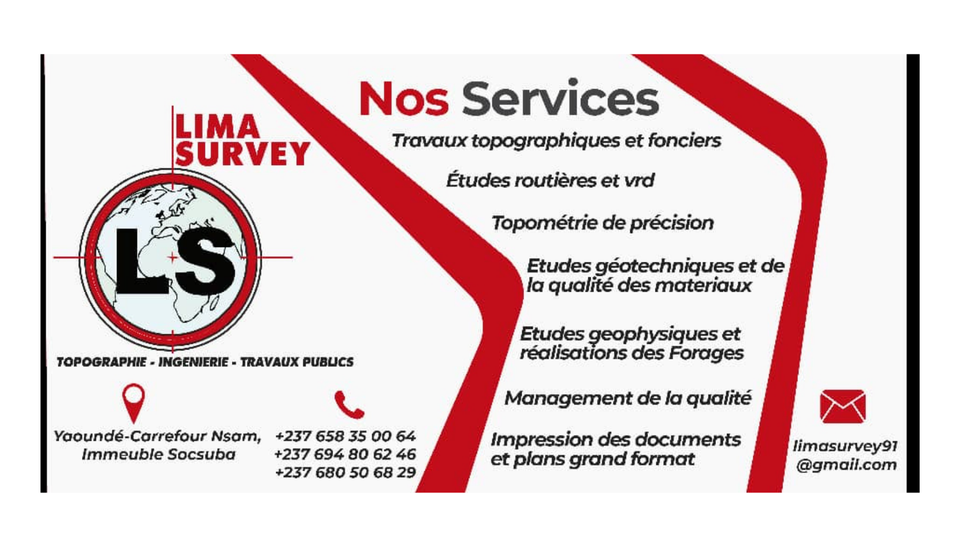 Lima Survey est une entreprise spécialisée dans le conseil, études des projets de bâtiment et travaux publics ainsi que des travaux de topographie. Lima Survey est situé à Yaoundé au quartier Nsam.