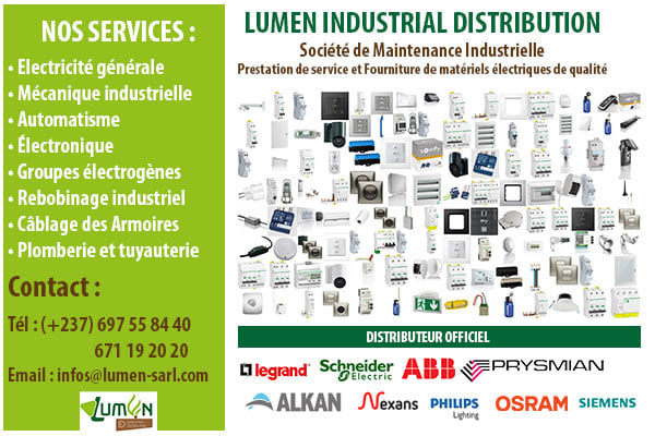 Lumen Sarl est une entreprise de maintenance industrielle et de vente de pièces détachées. Nous assurons efficacement la maintenance de vos équipements industriels, vous permettant de continuellement produire dans des conditions optimales. En se donnant pour mission de traiter les défaillances de vos systèmes de production afin de réduire, voire éliminer les arrêts de production, Lumen Sarl se positionne comme le partenaire du développement industriel Camerounais. Quel que soit vos besoins en électricité, Mécanique, Electronique, automatisme, plomberie, tuyauterie…nous disposons de l’expertise pour vous satisfaire. Nous assurons un service complet comprenant : l’étude, la conception et la réalisation de vos projets, la maintenance de vos équipements afin d’en assurer la disponibilité et la fiabilité, la rénovation, la modernisation, l’amélioration de vos équipements suivant vos besoins et souhaits, la fourniture d’une grande variété de matériels et de pièces détachées selon vos exigences.