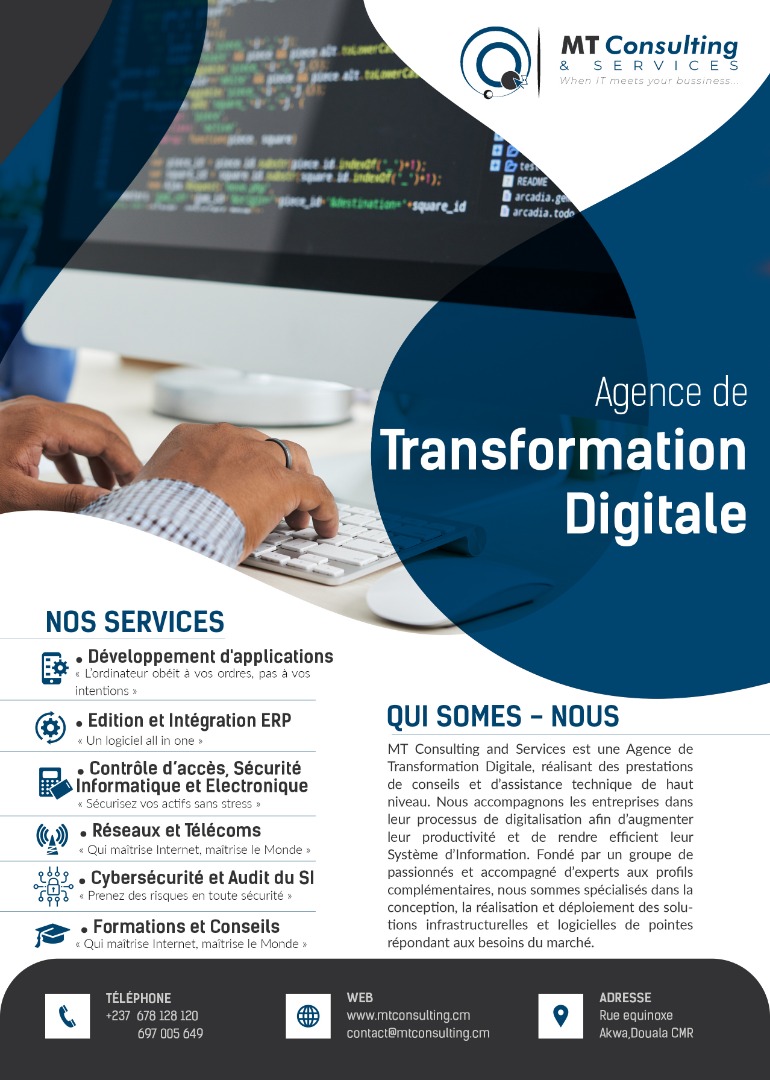 MT Consulting and Services est une agence de transformation digitale, réalisant des prestations de conseils et d’assistance technique de haut niveau. Nous accompagnons les entreprises dans leur processus de digitalisation afin d’augmenter leur productivité. Notre mission est de transformer la manière dont les entreprises gèrent leurs affaires. Nous rendons l’IT simple et totalement intégré. Nous aidons les organisations à grandir.