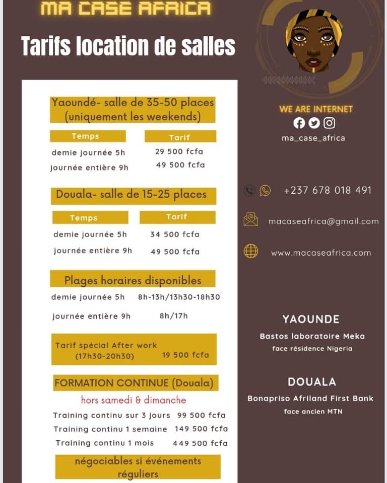 Ma Case Africa est une entreprise multiservice dont les activités tournent autour de la location d’espace de bureaux et de conférence, le marketing digital, l’événementiel et le design. Disposez désormais de salles polyvalentes de 20 à 30 places à Yaoundé Bastos, sis laboratoire Meka, face résidence du Nigeria et à Douala Bonapriso, sis immeuble Afriland, face ancien MTN. Organisez vos afterworks, vos meet-up réseautage wifi illimité gratuit ; location à l'heure, à la journée, à la semaine, au mois, selon votre convenance.