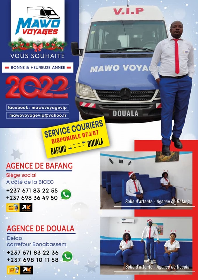 Mawo Voyages VIP est une agence de voyage offrant des services de transport interurbain entre les villes de Douala et Bafang au prix de 5000. Mawo Voyages VIP propose également un service de location de véhicules avec chauffeur et un service courrier opérationnel tous les jours.