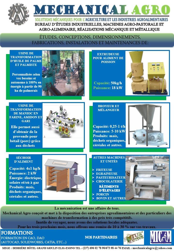 Mechanical Agro est une entreprise Camerounaise spécialisée dans la fabrication de machines et l'installation d'usines agro-alimentaire. Elle occupe un terrain aménagé dans le quartier Elig-Essono à Yaoundé; cela lui permet de mener des travaux de construction avec l'aide d'une équipe dynamique.