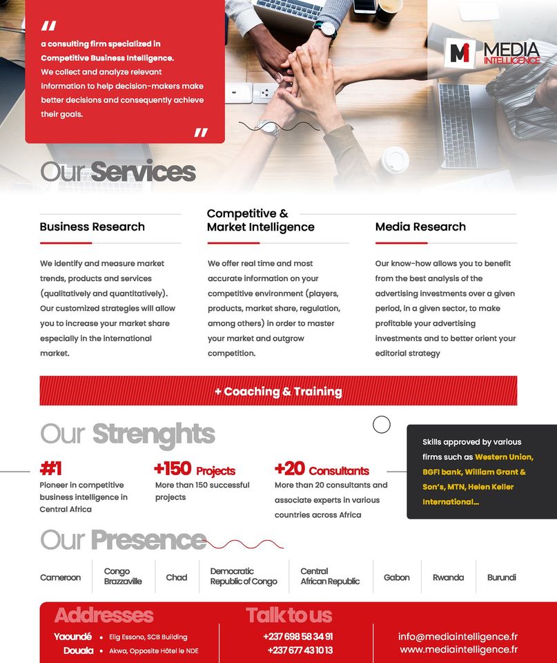 Media Intelligence(MI) est une société de veille économique et de recherche concurrentielle. Media Intelligence a été officiellement créée en 2007, puis recapitalisé en 2011. Depuis 2008, des demandes de prestation sur la RCA, le Tchad, la RDC, le Rwanda et le Gabon l’on pousser à y créer un réseau des ressources dédiées permettant ainsi de répondre efficacement aux multiples demandes clients. MI a pour siège social Yaoundé et Douala au Cameroun avec des représentations dans les différents pays cités plus haut. Nous avons le mérite d’être le tout premier cabinet camerounais spécialisé dans la veille stratégique et métiers connexes avec comme secteurs de spécialisation : les finances, les médias, les télécoms. Aujourd’hui la convergence entre ces trois secteurs nous donne une parfaite vue sur les évolutions et mutations dans ces secteurs évoqués et dans plusieurs autres.