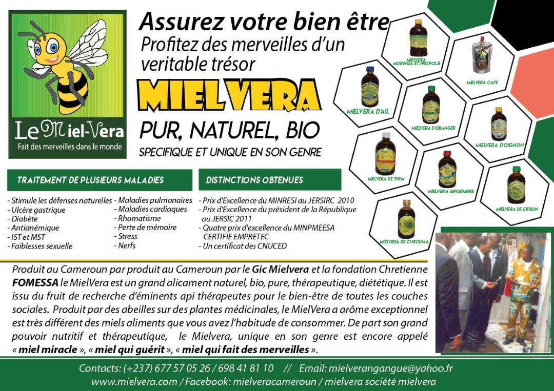Le Miel Vera est un alicament c’est-à-dire un aliment dont la composition explicitement formulée implique un effet actif sur la santé du consommateur. Les Ets Miel Vera offrent donc des gammes de miel aux saveurs café, ail, oignon, gingembre ou citron et aux vertus diverses provenant de plusieurs régions du Cameroun. Ils offrent également des laits de soja en poudre.