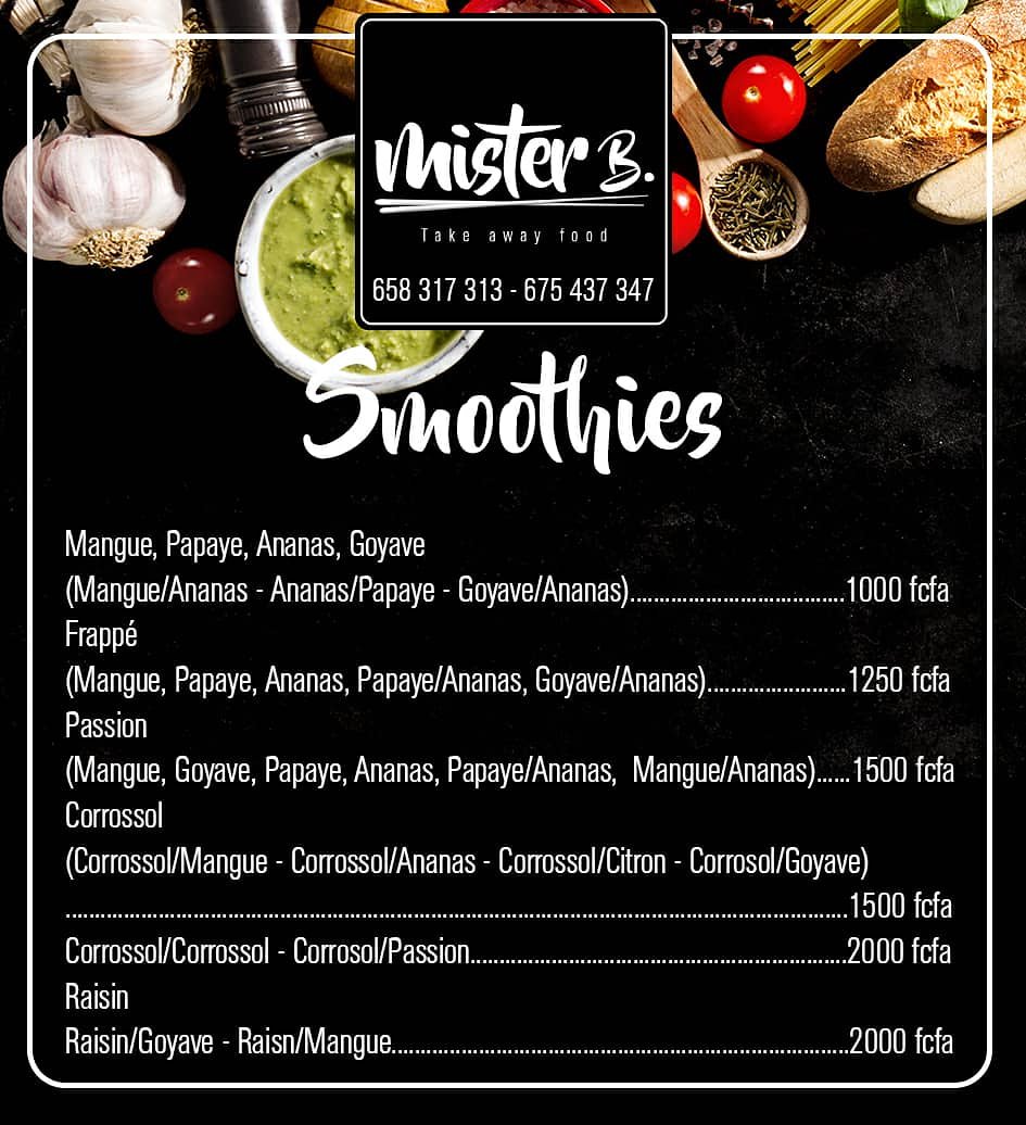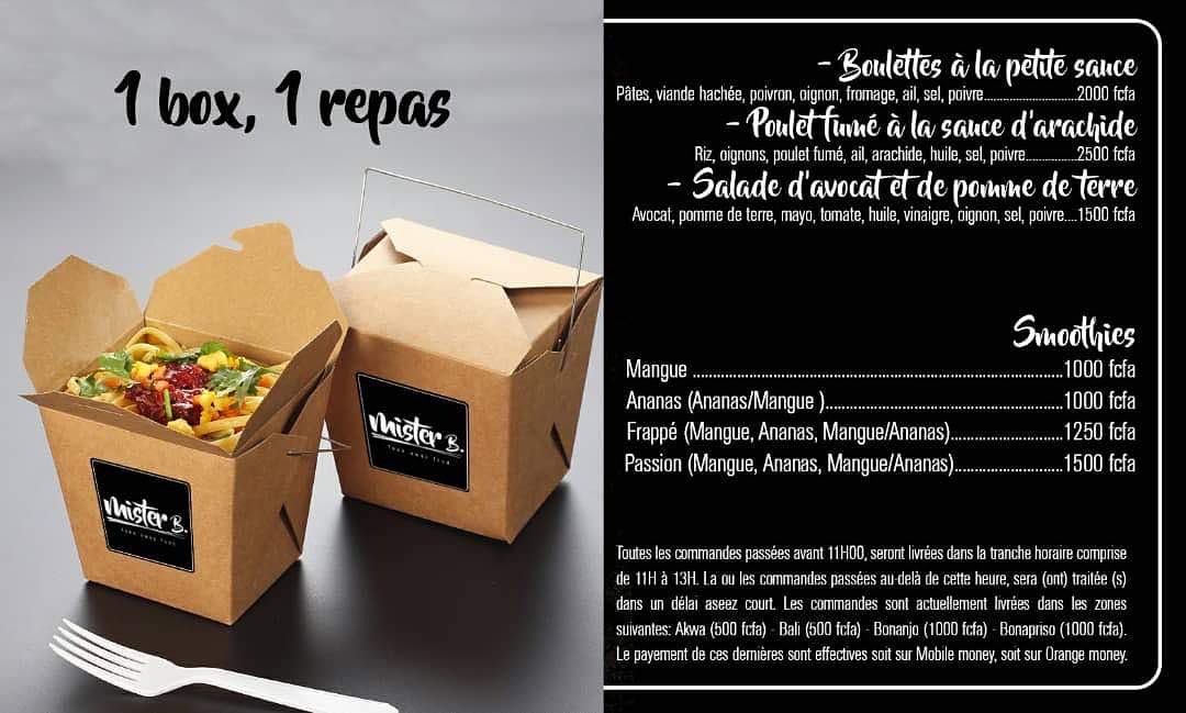 Mister B est un service de livraison de nourriture et de boissons (jus, smoothies). Pour le moment, nous livrons à Douala dans les quartiers Akwa, Bali, Bonanjo et Bonapriso. Chez Mister B., votre repas vous est livré où vous etes et arrive dans des boites en papier craft faites a partir de papier recyclé, entierement étanche et resistant à la chaleur.