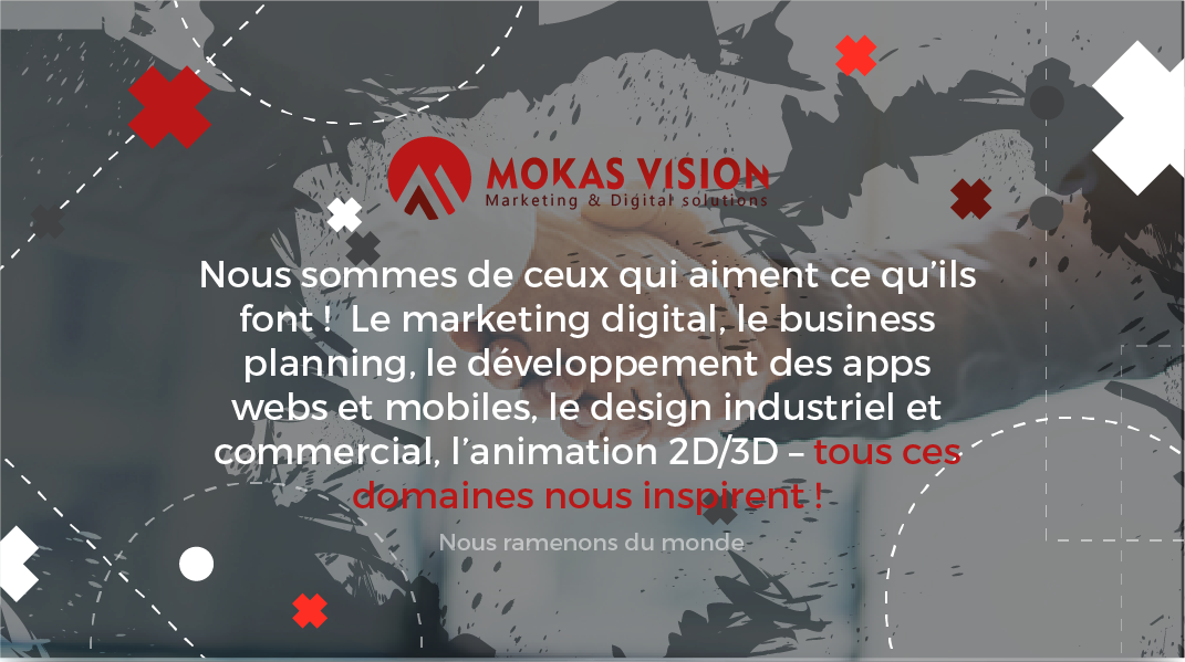 Mokas Vision est une agence digitale indépendante spécialisée dans le marketing et les solutions digitales basée à Yaoundé. Nous sommes le partenaire créatif qui vous fournira des outils et solutions modernes, fonctionnels qui permettront le développement de votre activité de manière durable. Nous réunissons sur une plateforme collaborative un panel d’experts et passionnés qui mettent à votre disposition un savoir-faire éprouvé sur de nombreux projets. Notre vision est très simple, toujours vous ramener plus de monde.