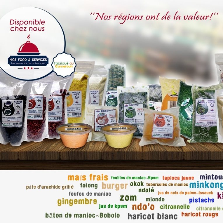 Nice Food & Services est une entreprise basée au Cameroun qui propose des produits locaux prêts à cuire, ainsi que la logistique nécessaire pour vos evenements. Elle mets en vente les feuilles de manioc pilées, jus de noix de palme, du manioc et les légumes.