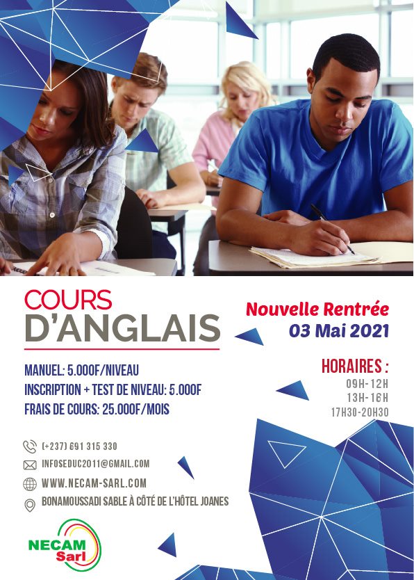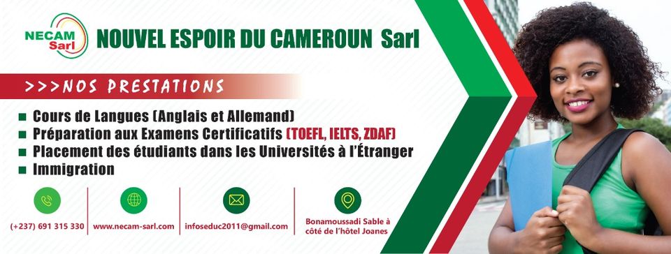 Necam Sarl est une société camerounaise engagée dans la formation professionnelle en anglais et en allemand et qui propose également des stages pour les étudiants dans les universités et collèges à l'étranger. Notre centre de formation en anglais est conçu pour faciliter votre processus d'apprentissage et vous préparer aux examens internationaux.