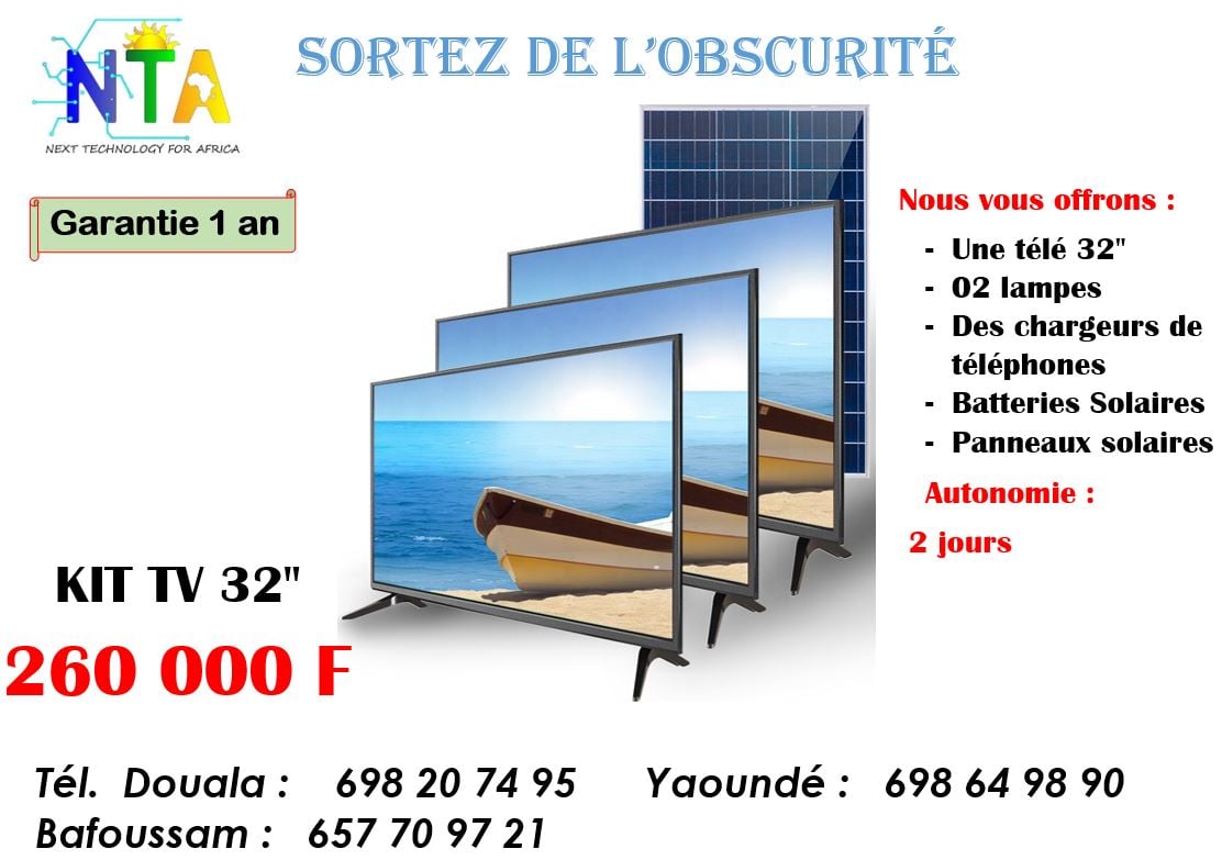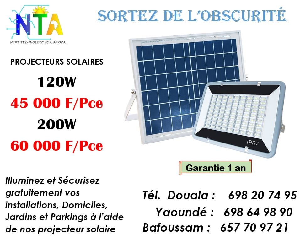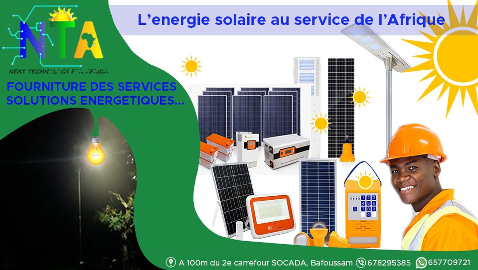Next Technology For Africa (NTA SARL) est une entreprise spécialisée dans l’installation et la commercialisation des systèmes solaires photovoltaïques. Face aux difficultés d'accès à l'énergie électrique des populations africaines et dans le but de pouvoir des solutions énergétiques de qualité et à portée de tous Next Technology For Africa vous permet d’être à l’abri des délestages. Nous sommes disponible pour vous servir dans les villes de Douala, Yaoundé et Bafoussam.