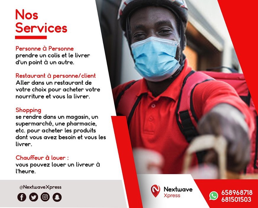 Nextwave Xpress est une entreprise qui propose des services de livraison à domicile dans les villes de Douala et Yaoundé au Cameroun. Repas, courrier, peu importe ce que vous désirez nous livrons ceci 24h/24 et 7j/7.