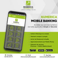 Numerica Finance S.A est un établissement de microfinance de 2ème catégorie qui offre des services diversifiés de banque classique et surtout de banque digitale. Numerica Finance S.A c’est une dizaine agences, une centaine de points agréés et plus de 45 000 clients. Nous accompagnons nos clients avec des produits adaptés à leurs besoins. Nos conditions de banque sont des plus souples et des plus attractives. Nos solutions de banque digitale répondent à trois préoccupations pressantes de la clientèle : accès aux services bancaires en tout temps et en tout lieu, accès aux services bancaires de proximité, accès aux services bancaires par la très petite clientèle.