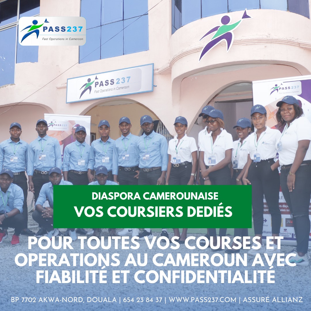 Pass 237 est une agence internationale de courses et services rapides. Une structure qui vous permet d’effectuer toutes vos opérations simples ou complexes au Cameroun. Nous proposons aux camerounais de la diaspora, d'avoir un opérateur coursier dédié pour la réalisation de toutes leurs commissions au Cameroun. Nous sommes vos yeux et vos oreilles au Cameroun. Pass 237 est basé au Cameroun plus précisément à Douala (Akwa Nord).