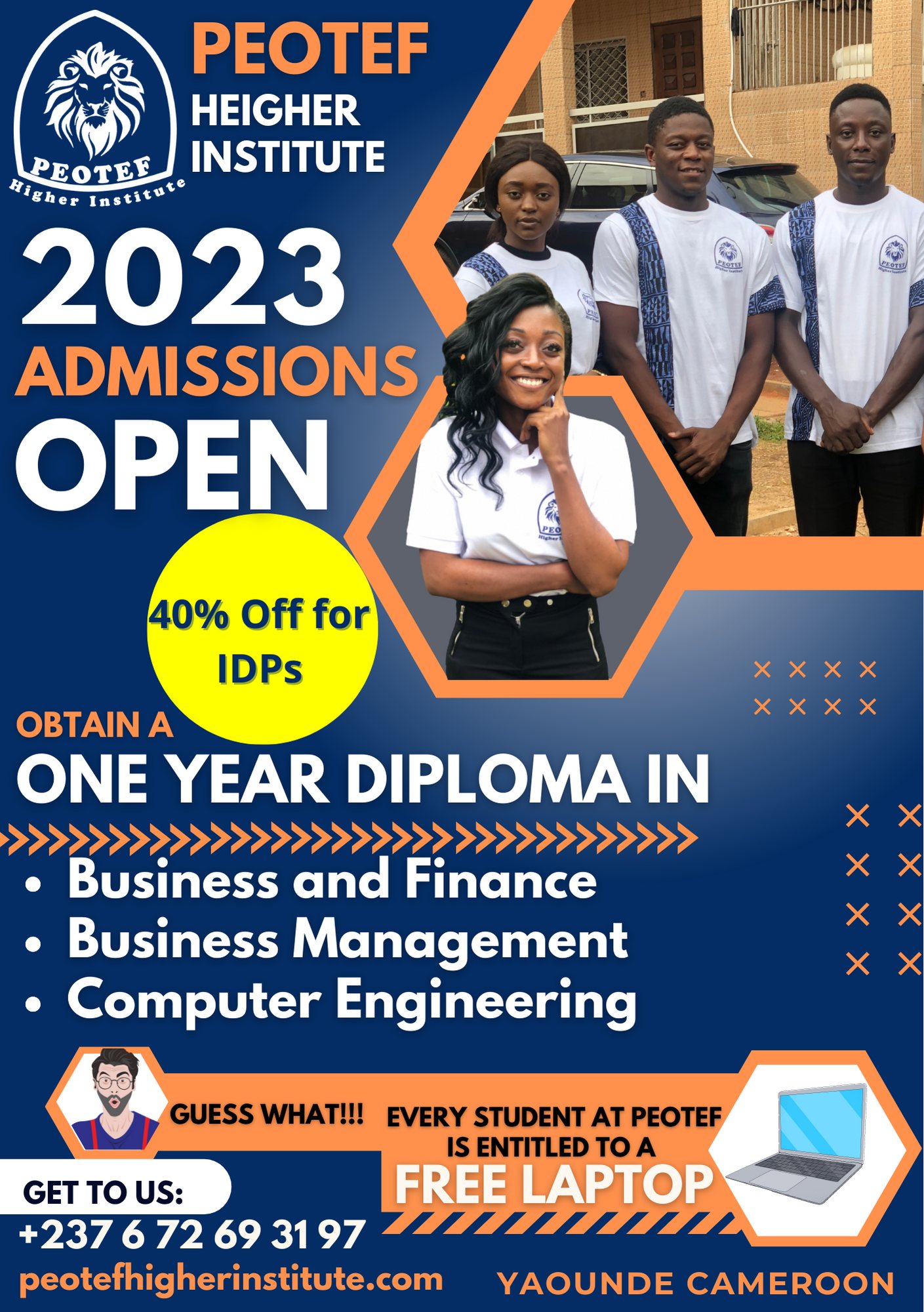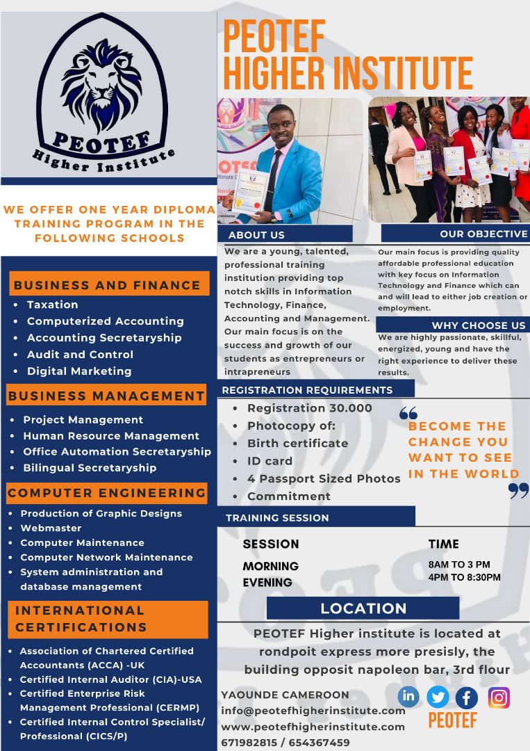 Peotef Higher Institute a été fondée en 2020 pour former de jeunes entrepreneurs et demandeurs d'emploi aux compétences dont ils avaient besoin pour naviguer dans l'environnement de travail. Son objectif principal était les outils de comptabilité tels qu'Excel, Sage et QuickBooks. En raison d'une augmentation de la demande pour ces services, la direction de la Peotef a jugé judicieux en 2022, de créer un institut professionnel qui permettra de former simultanément un nombre accru de professionnels qualifiés. C'est principalement ainsi qu'est né l'Institut Supérieur Peotef. L'Institut supérieur Peotef est un établissement d'enseignement professionnel axé particulièrement sur la formation d'entrepreneurs et d'intrapreneurs performants. Avec l'amélioration continue de la technologie sur le lieu de travail, la société a besoin de plus de professionnels qui comprennent comment utiliser ces changements pour répondre aux besoins croissants de l'humanité.