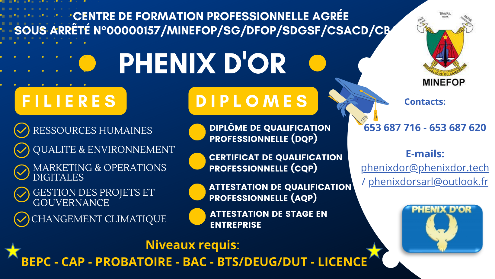 Phenix d'Or est une entreprise de conseil. Notre plateforme est axée sur les conseils en ressources humaines, la promotion des opportunités d’emploi et le développement des compétences (séminaires, coaching, formations métiers), tant en présentiel qu’en ligne, pour une plus grande flexibilité et visibilité de l’adéquation profil de poste et aptitudes recherchées. Nous vous offrons une expertise complète et innovante pour optimiser votre performance organisationnelle et votre attractivité employeur. Que vous soyez à la recherche d’un recrutement efficace, d’une fidélisation durable, d’une communication interne ou externe pertinente ou d’une formation adaptée à vos besoins, vous trouverez chez nous un partenaire engagé et créatif. Nous mettons à votre service notre savoir-faire, notre réseau et notre sens du service client. N’hésitez pas à nous contacter pour nous faire part de votre projet ou pour demander un devis gratuit. Phenix d'Or est présente à Yaoundé et à Douala.