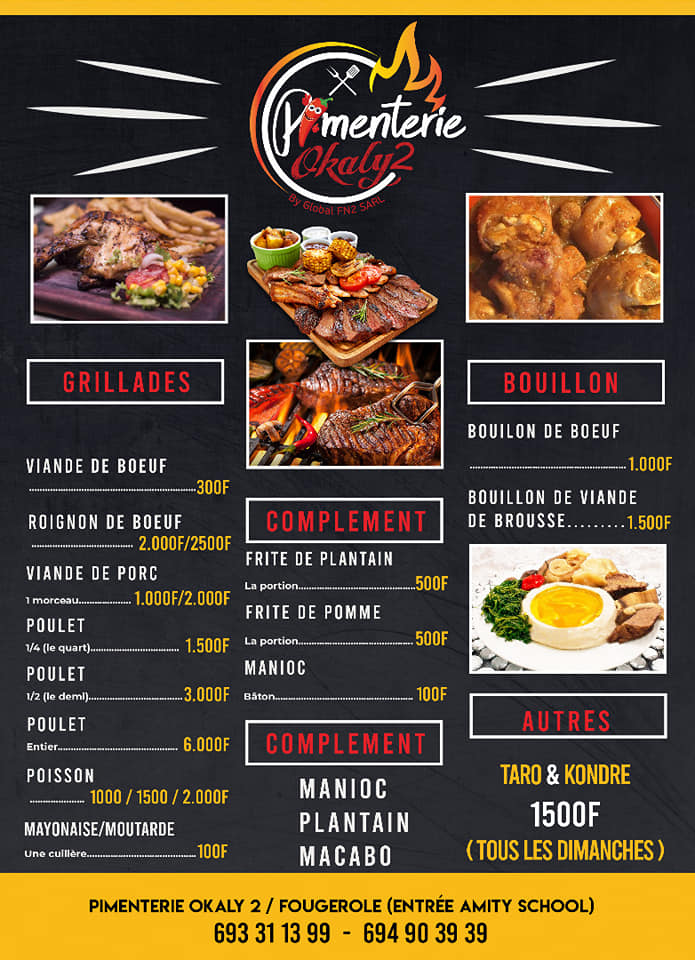 Situé à Yaoundé au quartier Fougerole, face entrée Amity School, la Pimenterie Okaly 2 est un fast food alliant un mélange des traditions ancestrales dans l'art du piment de chez nous. Laissez vos papilles gustatives voyager avec des grillades (viande de bœuf, poulet, poisson frais, crevette, viande de brousse) et du bouillon assaisonné aux épices de chez nous.