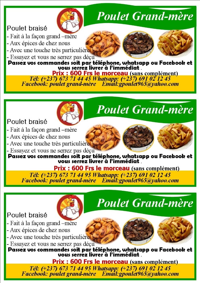 Poulet Grand-Mère est un un fast food qui fait du poulet braisé fait à la façon grande mère avec les épices de chez nous.