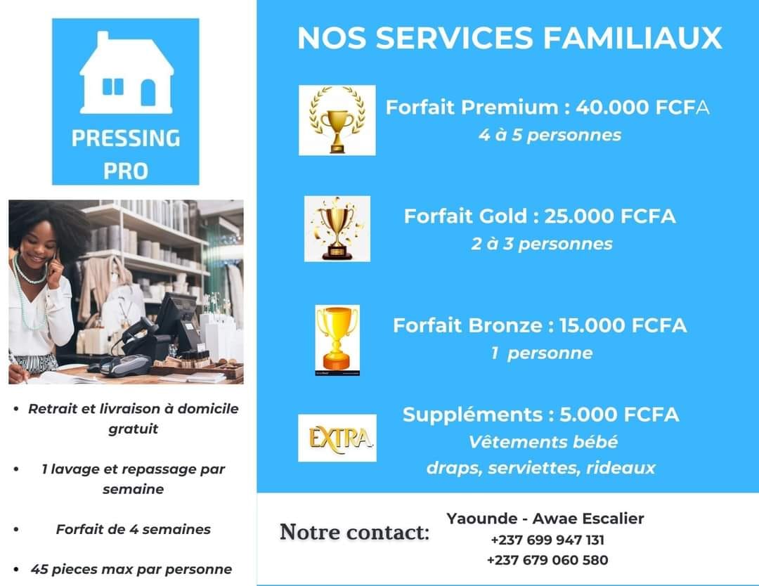 Pressing Pro est un service de nettoyage des vêtements. Nous proposons les services suivant : retrait à domicile de votre linge, lavage à chaud, lavage à froid, repassage à la vapeur, livraison à domicile (Forfait mensuelle, avec 4 lavages hebdomadaires). Fini le stress des grandes lessives à Yaoundé avec Pressing Pro ; Choisissez un forfait et une fois par semaine pendant un mois des professionnels retirent, lavent et livrent votre linges Clean et Net.