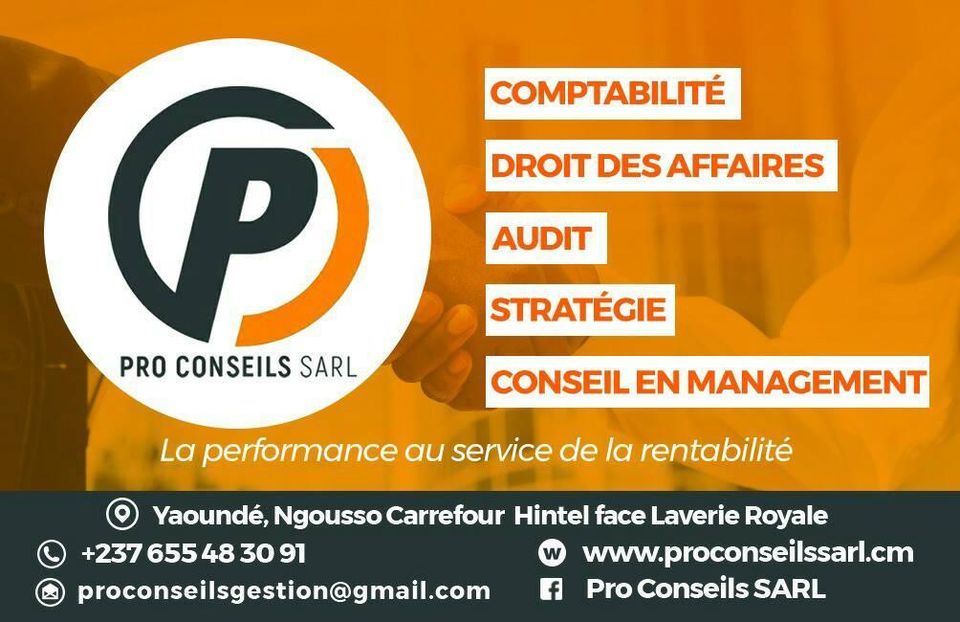 Pro Conseils Sarl est un réseau d’experts et de professionnels regroupés au sein de notre cabinet qui a pour activité principale : le conseil, l’étude et l’expertise dans les domaines de la comptabilité, droit des affaires, fiscalité, audit et management des entreprises. Créé pour apporter des solutions en toute prévisibilité, stabilité, certitude, précision et adéquation eu égard aux multiples problèmes et besoins opérationnels des Entrepreneurs, des entreprises nationales et internationales, les arguments d’impacts s’articulent autour de trois paliers bien définis : Accompagner les projets innovants à devenir des entreprises à forte valeur ajoutée ; accompagner les petites et moyennes entreprises à croître et devenir de grandes entreprises et accompagner les grandes entreprises à maintenir leur standing.