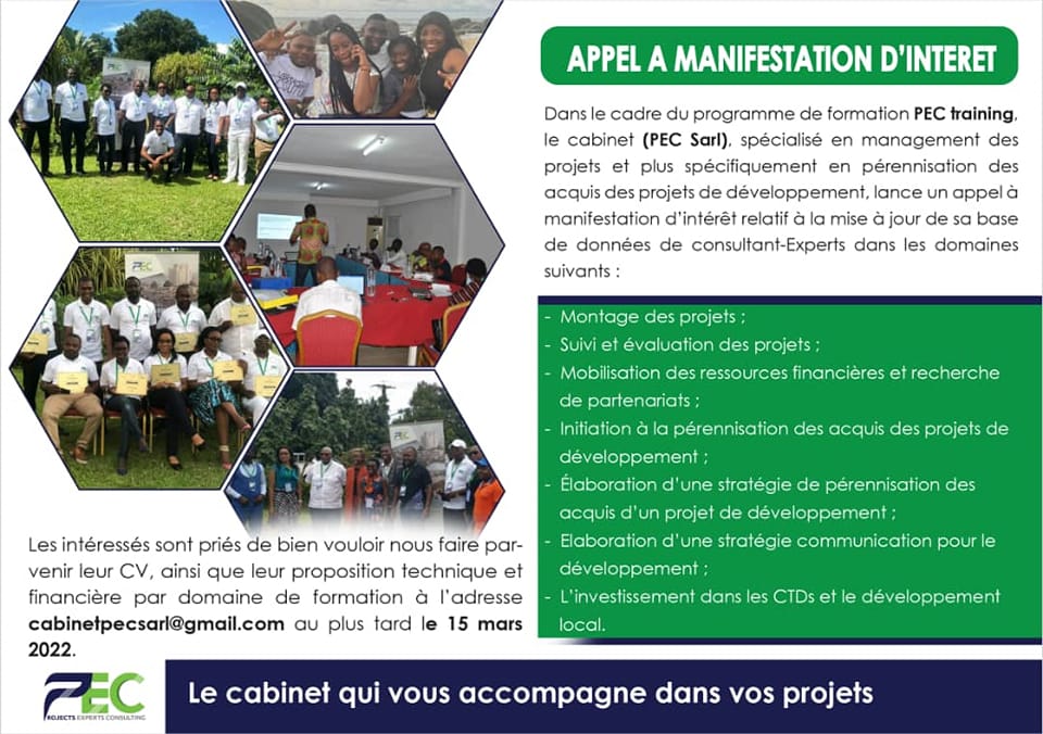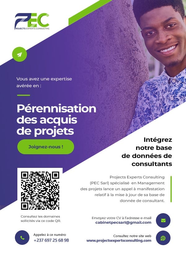 Créé en janvier 2018, Projects Experts Consulting (PEC) est un cabinet d’études conseil opérant principalement dans le management des projets de développement, spécialisé dans la pérennisation des acquis des projets de développement, l'ingénierie informatique et la prestation des services. Les services proposés sont adossées sur une approche méthodologique innovante, dans le but ultime de garantir de meilleures performances en termes d’impacts socio-économiques. GROUP PEC est basé à Yaoundé au quartier Efoulan.